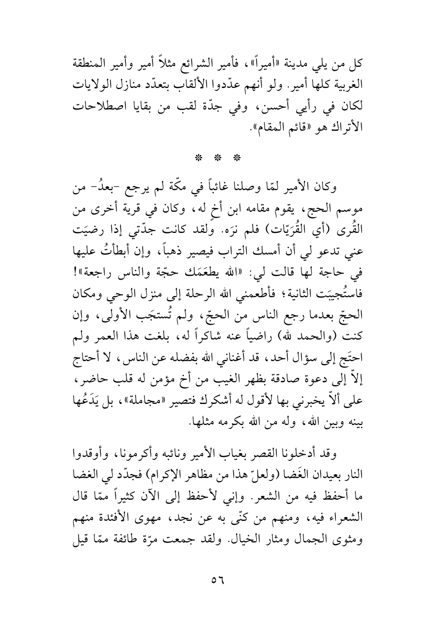 وكان الأمير لمّا وصلنا غائباً في مكّة لم يرجع -بعدُ- من موسم الحج، يقوم مقامه ابن أخٍ له، وكان في قرية أخرى من القُرى (أي القُرَيّات) فلم نرَه. ولقد كانت جدّتي إذا رضيَت عني تدعو لي أن أمسك التراب فيصير ذهباً، وإن أبطأتُ عليها في حاجة لها قالت لي: «الله يطعَمَك حجّة والناس راجعة»! فاستُجيبَت الثانية؛ فأطعمني الله الرحلة إلى منزل الوحي ومكان الحجّ بعدما رجع الناس من الحجّ، ولم تُستجَب الأولى، وإن كنت (والحمد لله) راضياً عنه شاكراً له، بلغت هذا العمر ولم احتَج إلى سؤال أحد، قد أغناني الله بفضله عن الناس، لا أحتاج إلاّ إلى دعوة صادقة بظهر الغيب من أخ مؤمن له قلب حاضر، على ألاّ يخبرني بها لأقول له أشكرك فتصير «مجاملة»، بل يَدَعُها بينه وبين الله، وله من الله بكرمه مثلها.