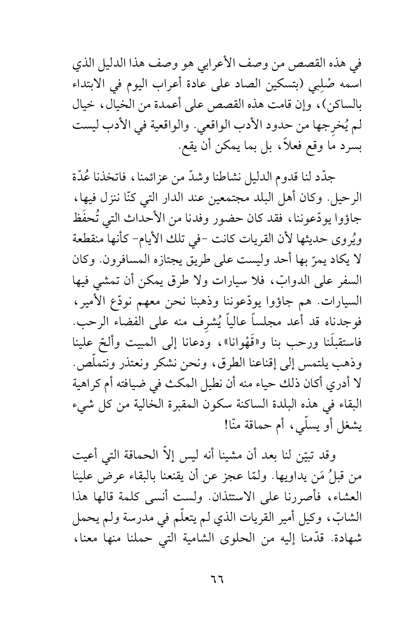 في هذه القصص من وصف الأعرابي هو وصف هذا الدليل الذي اسمه صْلِبي (بتسكين الصاد على عادة أعراب اليوم في الابتداء بالساكن)، وإن قامت هذه القصص على أعمدة من الخيال، خيال لم يُخرِجها من حدود الأدب الواقعي. والواقعية في الأدب ليست بسرد ما وقع فعلاً، بل بما يمكن أن يقع.