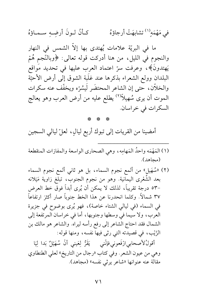 ما في البريّة علامات يُهتدى بها إلاّ الشمس في النهار والنجوم في الليل، من هنا أدركت قوله تعالى: {وبالنّجمِ هُمْ يَهتدونَ}، وعرفت سرّ اعتماد العرب عليها في تحديد مواقع البلدان وولع الشعراء بذكرها عند غلَبة الشوق إلى أرض الأحبّة والخلاّن، حتى إن الشاعر المحتضَر لَيسُرّه ويخفّف عنه سكرات الموت أن يرى سُهيلاً (¬2) يطلع عليه من أرض العرب وهو يعالج السكرات في خراسان.