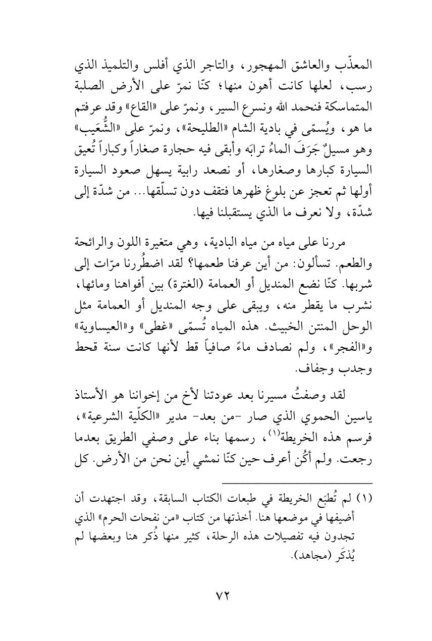 لقد وصفتُ مسيرنا بعد عودتنا لأخ من إخواننا هو الأستاذ ياسين الحموي الذي صار -من بعد- مدير «الكلّية الشرعية»، فرسم هذه الخريطة (¬1)، رسمها بناء على وصفي الطريق بعدما رجعت. ولم أكُن أعرف حين كنّا نمشي أين نحن من الأرض. كل