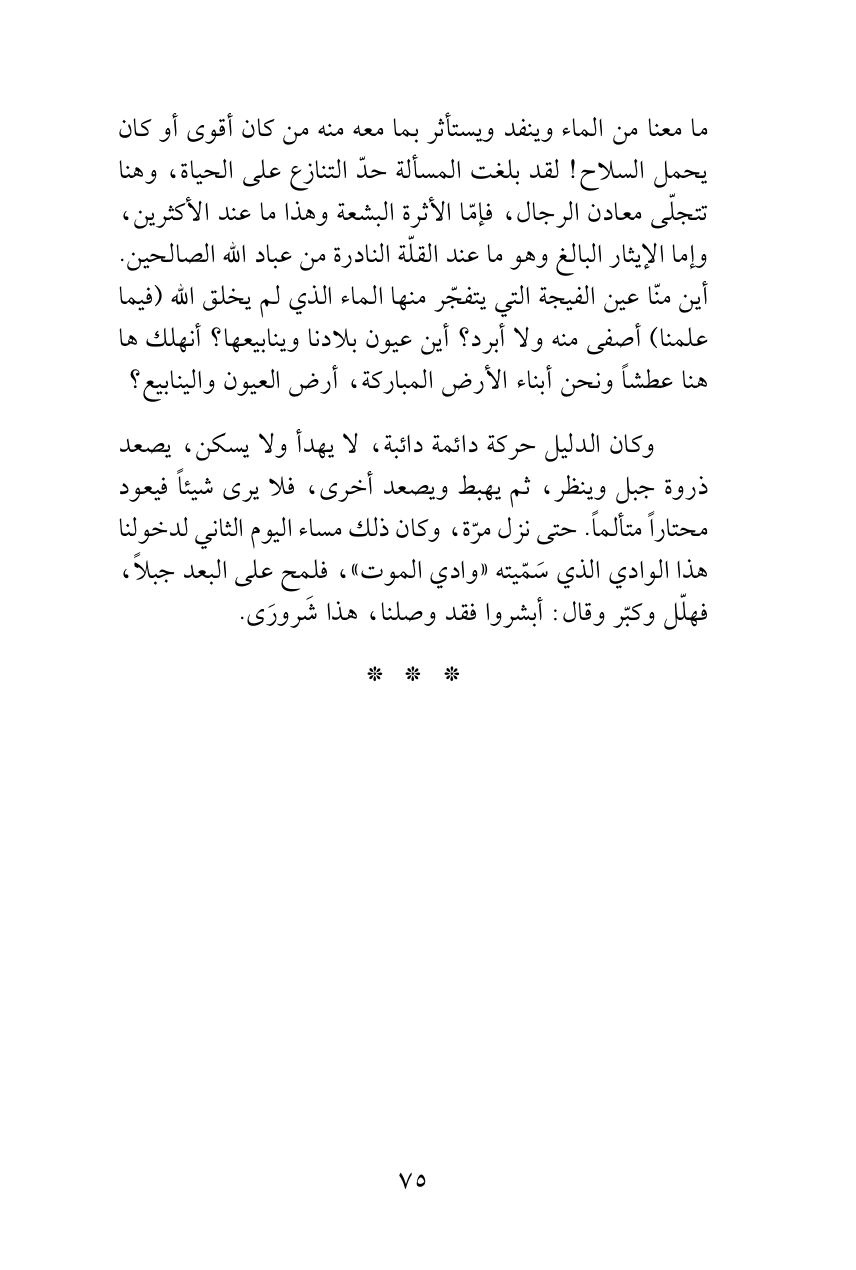 وكان الدليل حركة دائمة دائبة، لا يهدأ ولا يسكن، يصعد ذروة جبل وينظر، ثم يهبط ويصعد أخرى، فلا يرى شيئاً فيعود محتاراً متألماً. حتى نزل مرّة، وكان ذلك مساء اليوم الثاني لدخولنا هذا الوادي الذي سَمّيته «وادي الموت»، فلمح على البعد جبلاً، فهلّل وكبّر وقال: أبشروا فقد وصلنا، هذا شَرورَى.