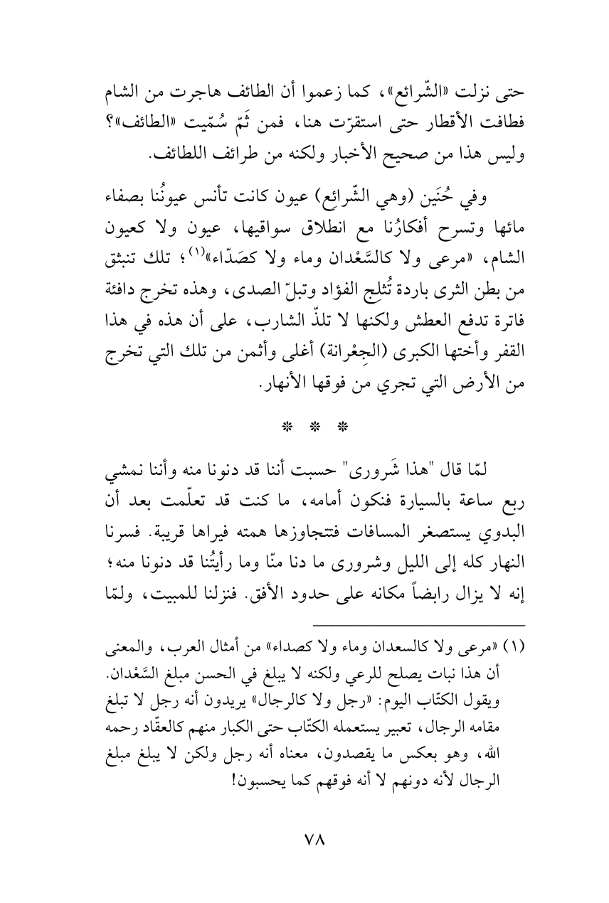 وفي حُنَين (وهي الشّرائِع) عيون كانت تأنس عيونُنا بصفاء مائها وتسرح أفكارُنا مع انطلاق سواقيها، عيون ولا كعيون الشام، «مرعى ولا كالسَّعْدان وماء ولا كصَدّاء» (¬1)؛ تلك تنبثق من بطن الثرى باردة تُثلِج الفؤاد وتبلّ الصدى، وهذه تخرج دافئة فاترة تدفع العطش ولكنها لا تلذّ الشارب، على أن هذه في هذا القفر وأختها الكبرى (الجِعْرانة) أغلى وأثمن من تلك التي تخرج من الأرض التي تجري من فوقها الأنهار.