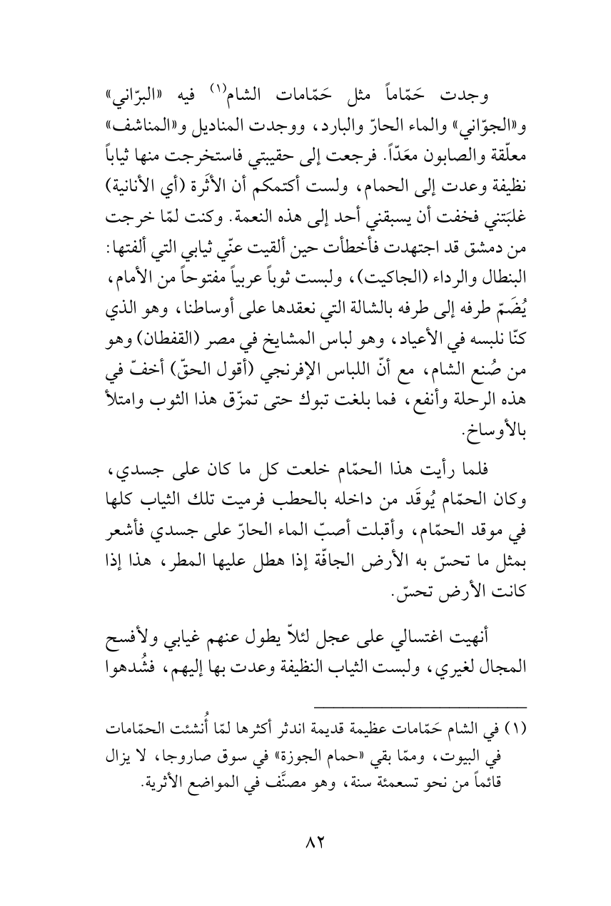 فلما رأيت هذا الحمّام خلعت كل ما كان على جسدي، وكان الحمّام يُوقَد من داخله بالحطب فرميت تلك الثياب كلها في موقد الحمّام، وأقبلت أصبّ الماء الحارّ على جسدي فأشعر بمثل ما تحسّ به الأرض الجافّة إذا هطل عليها المطر، هذا إذا كانت الأرض تحسّ.