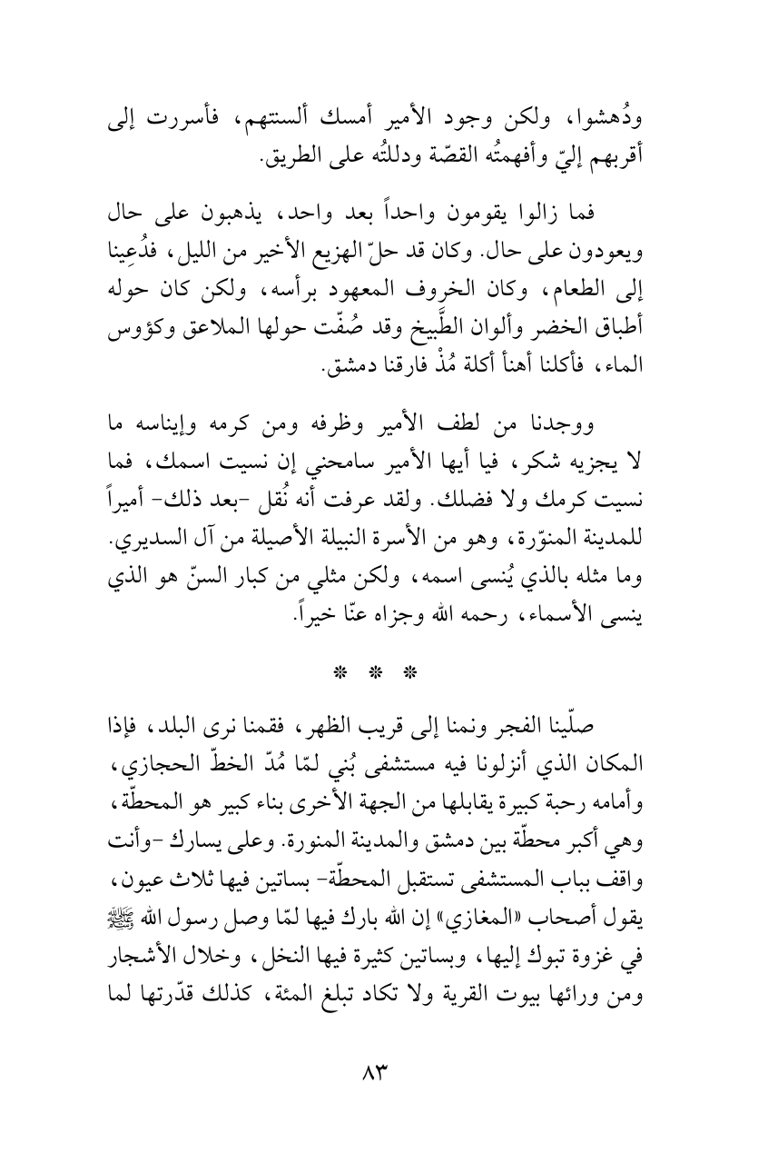 ودُهشوا، ولكن وجود الأمير أمسك ألسنتهم، فأسررت إلى أقربهم إليّ وأفهمتُه القصّة ودللتُه على الطريق.
