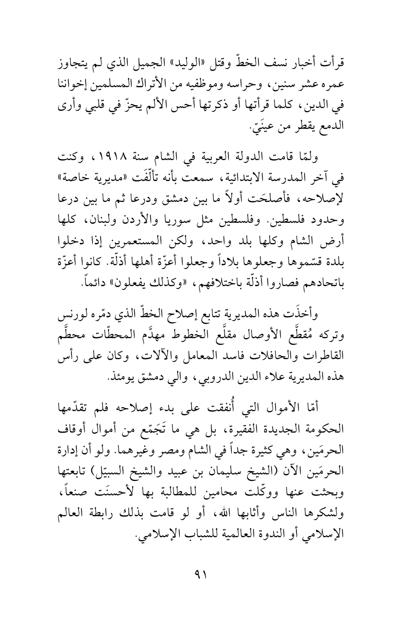 قرأت أخبار نسف الخطّ وقتل «الوليد» الجميل الذي لم يتجاوز عمره عشر سنين، وحراسه وموظفيه من الأتراك المسلمين إخواننا في الدين، كلما قرأتها أو ذكرتها أحس الألم يحزّ في قلبي وأرى الدمع يقطر من عينَيّ.