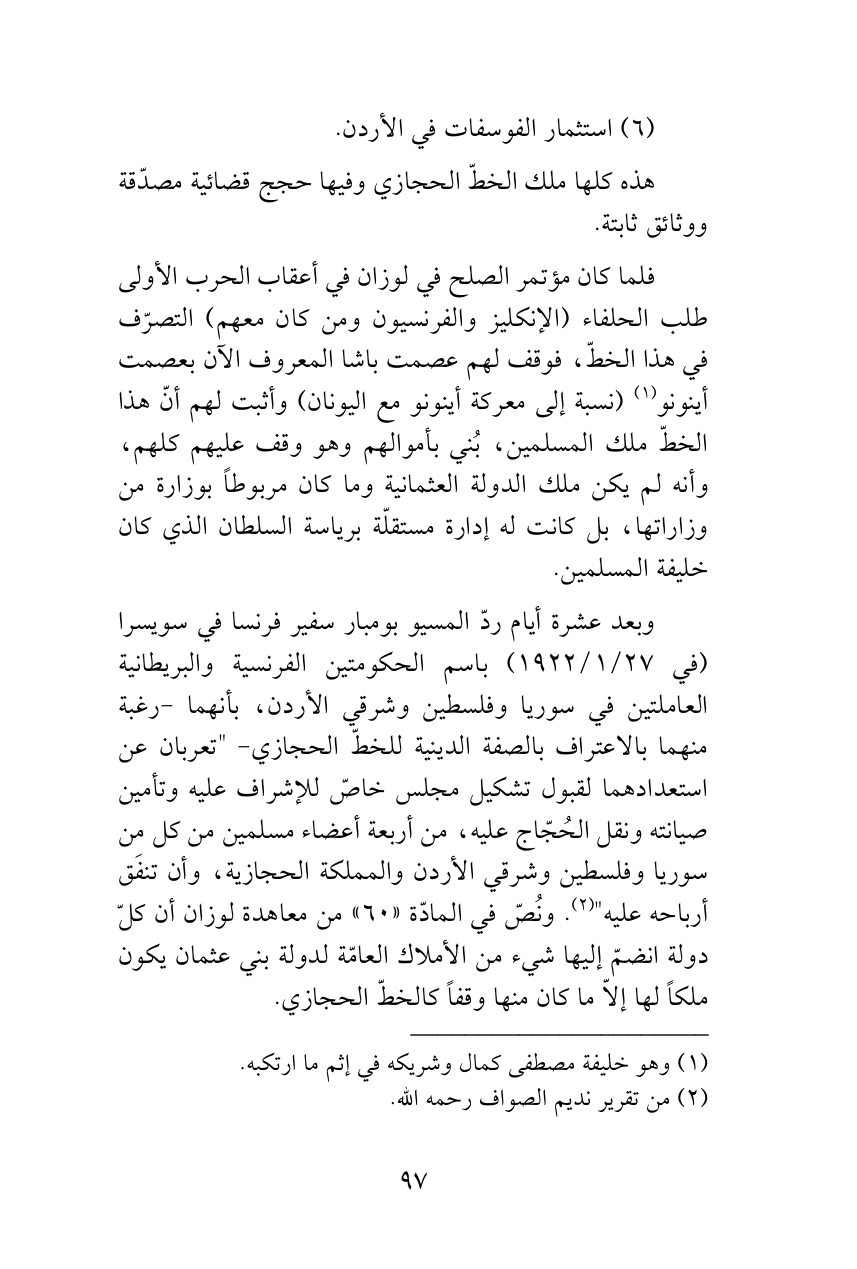 وبعد عشرة أيام ردّ المسيو بومبار سفير فرنسا في سويسرا (في 27/ 1/1922) باسم الحكومتين الفرنسية والبريطانية العاملتين في سوريا وفلسطين وشرقي الأردن، بأنهما -رغبة منهما بالاعتراف بالصفة الدينية للخطّ الحجازي- "تعربان عن استعدادهما لقبول تشكيل مجلس خاصّ للإشراف عليه وتأمين صيانته ونقل الحُجّاج عليه، من أربعة أعضاء مسلمين من كل من سوريا وفلسطين وشرقي الأردن والمملكة الحجازية، وأن تنفَق أرباحه عليه" (¬2). ونُصّ في المادّة «60» من معاهدة لوزان أن كلّ دولة انضمّ إليها شيء من الأملاك العامّة لدولة بني عثمان يكون ملكاً لها إلاّ ما كان منها وقفاً كالخطّ الحجازي.