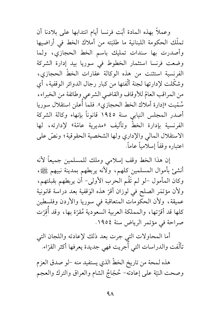 إن هذا الخط وقف إسلامي وملك للمسلمين جميعاً لأنه أنشئ بأموال المسلمين كلهم، ولأنه يربطهم بمدينة نبيهم ‘، وكان المأمول -لو لم تَقُم الحرب الأولى- أن يربطهم بقبلتهم، ولأن مؤتمَر الصلح في لوزان أقرّ هذه الوَقفية بعد دراسة قانونية عميقة، ولأن الحكومات المتعاقبة في سوريا والأردن وفلسطين كلها قد أقرّتها، والمملكة العربية السعودية مُقرّة بها، وقد أُقِرّت صراحة في مؤتمر الرياض سنة 1954.