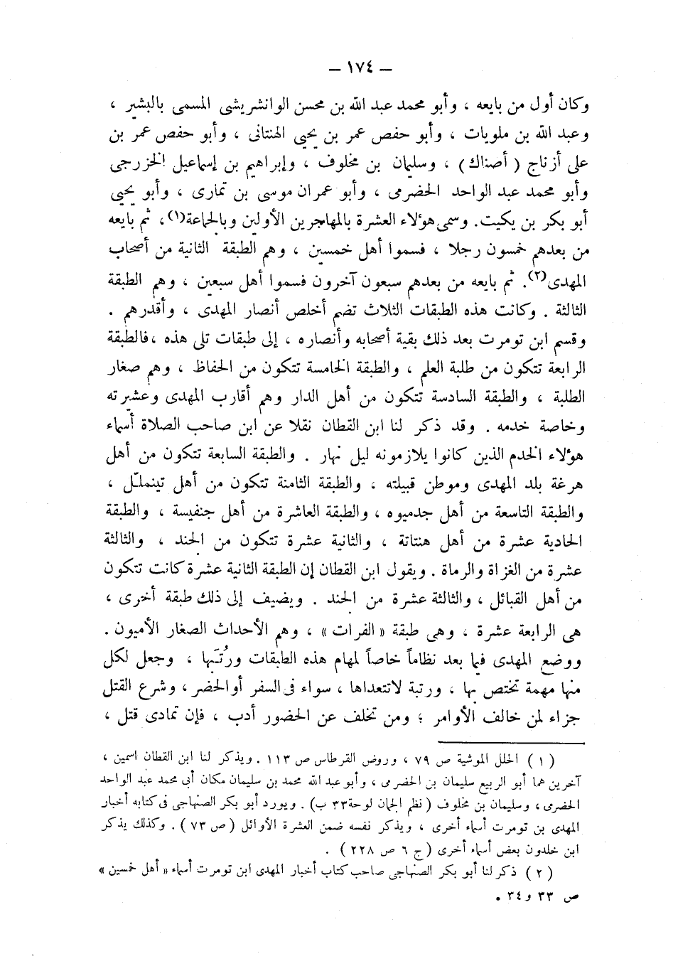 (¬1) الحلل الموشية ص 79، وروض القرطاس ص 113. ويذكر لنا ابن القطان اسمين آخرين هما أبو الربيع سليمان بن الحضرمي، وأبو عبد الله محمد بن سليمان مكان أبي محمد عبد الواحد الحضرمي، وسليمان بن مخلوف (نظم الجمان لوحة 33 ب). ويورد أبو بكر الصنهاجي في كتابه أخبار المهدي بن تومرت أسماء أخرى، ويذكر نفسه ضمن العشرة الأوائل (ص 73). وكذلك يذكر ابن خلدون بعض أسماء أخرى (ج 6 ص 228).