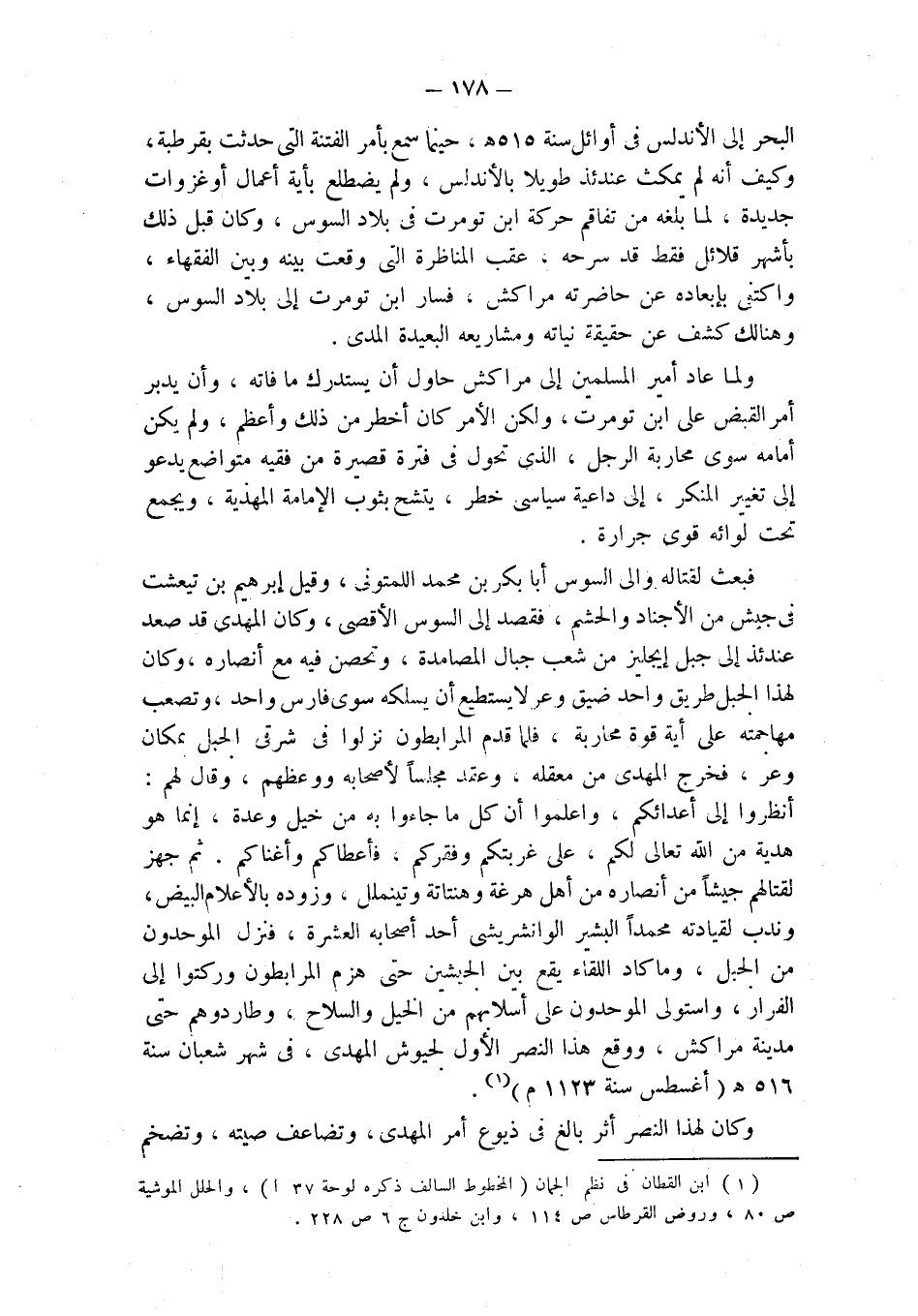 البحر إلى الأندلس في أوائل سنة 515 هـ، حينما سمع بأمر الفتنة التي حدثت بقرطبة، وكيف أنه لم يمكث عندئذ طويلا بالأندلس، ولم يضطلع بأية أعمال أو غزوات جديدة، لما بلغه من تفاقم حركة ابن تومرت في بلاد السوس، وكان قبل ذلك بأشهر قلائل فقط قد سرحه، عقب المناظرة التي وقعت بينه وبين الفقهاء، واكتفى بإبعاده عن حاضرته مراكش، فسار ابن تومرت إلى بلاد السوس، وهنالك كشف عن حقيقة نياته ومشاريعه البعيدة المدى.