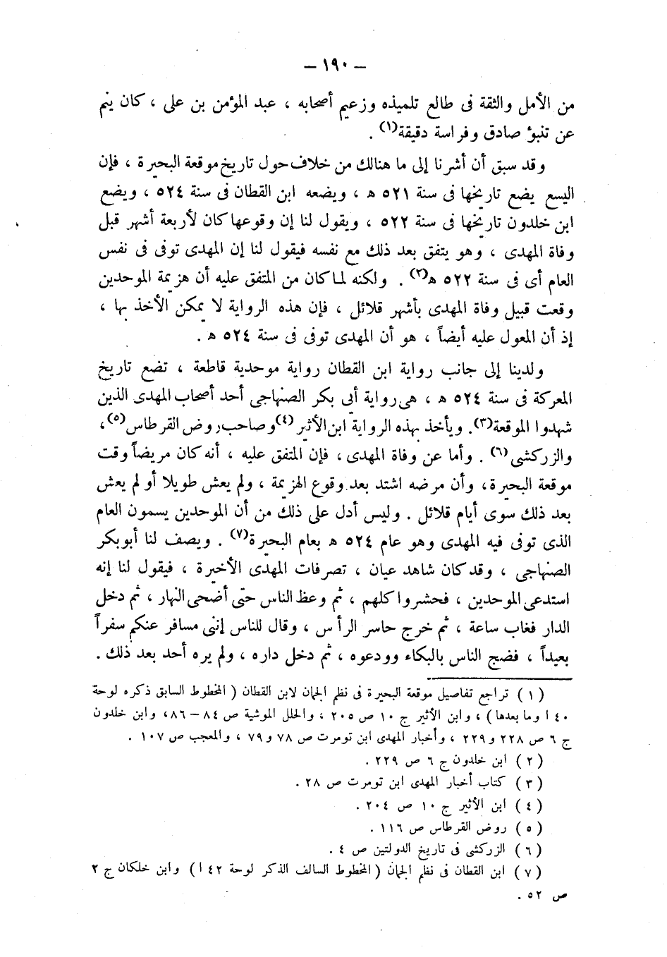 وقد سبق أن أشرنا إلى ما هنالك من خلاف حول تاريخ موقعة البحيرة، فإن اليسع يضع تاريخها في سنة 521 هـ، ويضعه ابن القطان في سنة 524، ويضع ابن خلدون تاريخها في سنة 522، ويقول لنا ان وقوعها كان لأربعة أشهر قبل وفاة المهدي، وهو يتفق بعد ذلك مع نفسه فيقول لنا إن المهدي توفي في نفس العام أي في سنة 522 هـ (¬2). ولكنه لما كان من المتفق عليه أن هزيمة الموحدين وقعت قبيل وفاة المهدي بأشهر قلائل، فإن هذه الرواية لا يمكن الأخذ بها، إذ أن المعول عليه أيضاً، هو أن المهدي توفي في سنة 524 هـ.