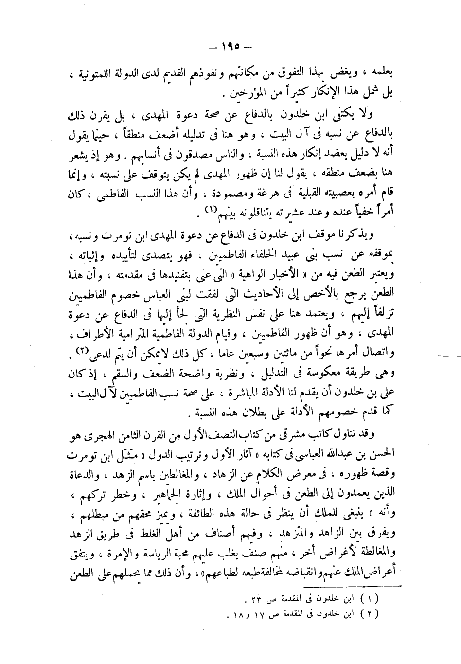 ولا يكتفي ابن خلدون بالدفاع عن صحة دعوة المهدي، بل يقرن ذلك بالدفاع عن نسبه في آل البيت، وهو هنا في تدليله أضعف منطقاً، حينما يقول أنه لا دليل يعضد إنكار هذه النسبة، والناس مصدقون في أنسابهم. وهو إذ يشعر هنا بضعف منطقه، يقول لنا إن ظهور المهدي لم يكن يتوقف على نسبته، وإنما قام أمره بعصبيته القبلية في هرغة ومصمودة، وأن هذا النسب الفاطمي، كان أمراً خفياً عنده وعند عشيرته يتناقلونه بينهم (¬1).
