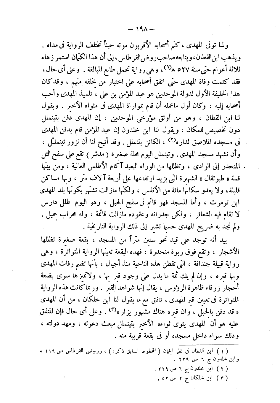 بيد أنه توجد على قيد نحو ستين متراً من المسجد، بقعة صغيرة تظللها الأشجار، وتقع فوق ربوة منحدرة، فهذه البقعة تعينها الرواية المتواترة، وهي رواية قبيلة جندافة، التي تقطن هذه الناحية منذ أجيال، بأنها تضم رفات المهدي وبها قبره، وإن لم يك ثمة ما يدل على وجود قبر بها، ولا تميزها سوى بضعة أحجار زرقاء ظاهرة الرؤوس، يقال إنها شواهد القبر. وربما كانت هذه الرواية المتواترة في تعيين قبر المهدي، تتفق مع ما يقوله لنا ابن خلكان، من أن المهدي " قد دفن بالجبل، وان قبره هناك مشهور يزار " (¬3). وعلى أي حال فإن المتفق عليه هو أن المهدي يثوى ثواءه الأخير بتينملل مبعث دعوته، ومهد دولته، وذلك سواء داخل مسجده أو في بقعة قريبة منه.