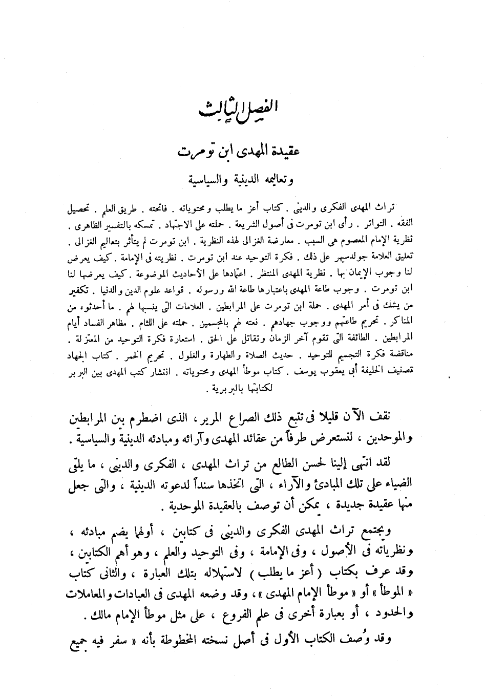تراث المهدي الفكري والديني. كتاب أعز ما يطلب ومحتوياته. فاتحته. طريق العلم. تحصيل الفقه. التواتر. رأي ابن تومرت في أصول الشريعة. حملته على الاجتهاد. تمسكه بالتفسير الظاهري. نظرية الإمام المعصوم هي السبب. معارضة الغزالي لهذه النظرية. ابن تومرت لم يتأثر بتعاليم الغزالي. تعليق العلامة جولدسيهر على ذلك. فكرة التوحيد عند ابن تومرت. نظريته في الإمامة. كيف يعرض لنا وجوب الإيمان بها. نظرية المهدي المنتظر. اعتمادها على الأحاديث الموضوعة. كيف يعرضها لنا ابن تومرت. وجوب طاعة المهدي باعتبارها طاعة الله ورسوله. قواعد علوم الدين والدنيا. تكفير من يشك في أمر المهدي. حملة ابن تومرت على المرابطين. العلامات التي ينسبها لهم. ما أحدثوه من المناكر. تحريم طاعتهم ووجوب جهادهم. نعته لهم بالمجسمين. حملته على اللثام. مظاهر الفساد أيام المرابطين. الطائفة التي تقوم آخر الزمان وتقاتل على الحق. استعارة فكرة التوحيد من المعتزلة. مناقضة فكرة التجسيم للتوحيد. حديث الصلاة والطهارة والغلول. تحريم الخمر. كتاب الجهاد تصنيف الخليفة أبي يعقوب يوسف. كتاب موطأ المهدي ومحتوياته. انتشار كتب المهدي بين البربر لكتابتها بالبربرية.