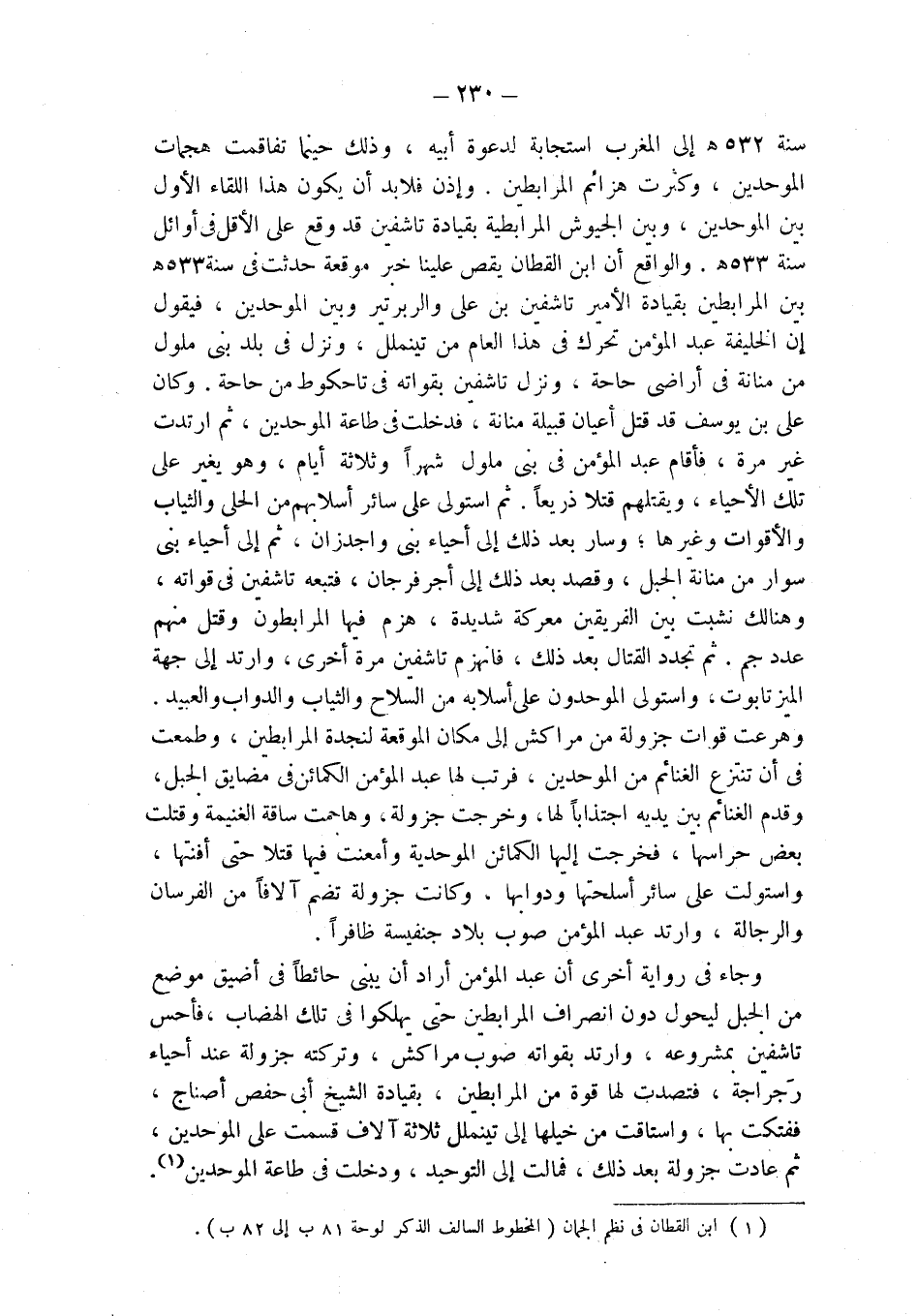 سنة 532 هـ إلى المغرب استجابة لدعوة أبيه، وذلك حينما تفاقمت هجمات الموحدين، وكثرت هزائم المرابطين. وإذن فلابد أن يكون هذا اللقاء الأول بين الموحدين، وبين الجيوش المرابطية بقيادة تاشفين قد وقع على الأقل في أوائل سنة 533 هـ. والواقع أن ابن القطان يقص علينا خبر موقعة حدثت في سنة 533 هـ بين المرابطين بقيادة الأمير تاشفين بن علي والربرتير وبين الموحدين، فيقول إن الخليفة عبد المؤمن تحرك في هذا العام من تينملل، ونزل في بلد بني ملول من منانة في أراضي حاحة، ونزل تاشفين بقواته في تاحكوط من حاحة، وكان علي بن يوسف قد قتل أعيان قبيلة منانة، فدخلت في طاعة الموحدين، ثم ارتدت غير مرة، فأقام عبد المؤمن في بني ملول شهراً وثلاثة أيام، وهو يغير على تلك الأحياء، ويقتلهم قتلا ذريعاً. ثم استولى على سائر أسلابهم من الحلي والثياب والأقوات وغيرها؛ وسار بعد ذلك إلى أحياء بني واجدزان، ثم إلى أحياء بني سوار من منانة الجبل، وقصد بعد ذلك إلى أجرفرجان، فتبعه تاشفين في قواته، وهنالك نشبت بين الفريقين معركة شديدة، هزم فيها المرابطون وقتل منهم عدد جم. ثم تجدد القتال بعد ذلك، فانهزم تاشفين مرة أخرى، وارتد إلى جهة الميزتابوت، واستولى الموحدون على أسلابه من السلاح والثياب والدواب والعبيد.