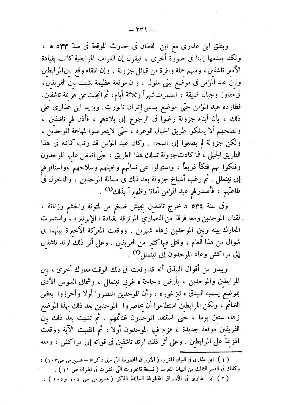 (¬1) ابن عذارى في البيان المغرب (الأوراق المخطوطة التي سبق ذكرها - هسبيرس ص 103)، وكذلك في القسم الثالث من البيان المغرب (نسخة تامجروت التي نشرت في تطوان ص 11).