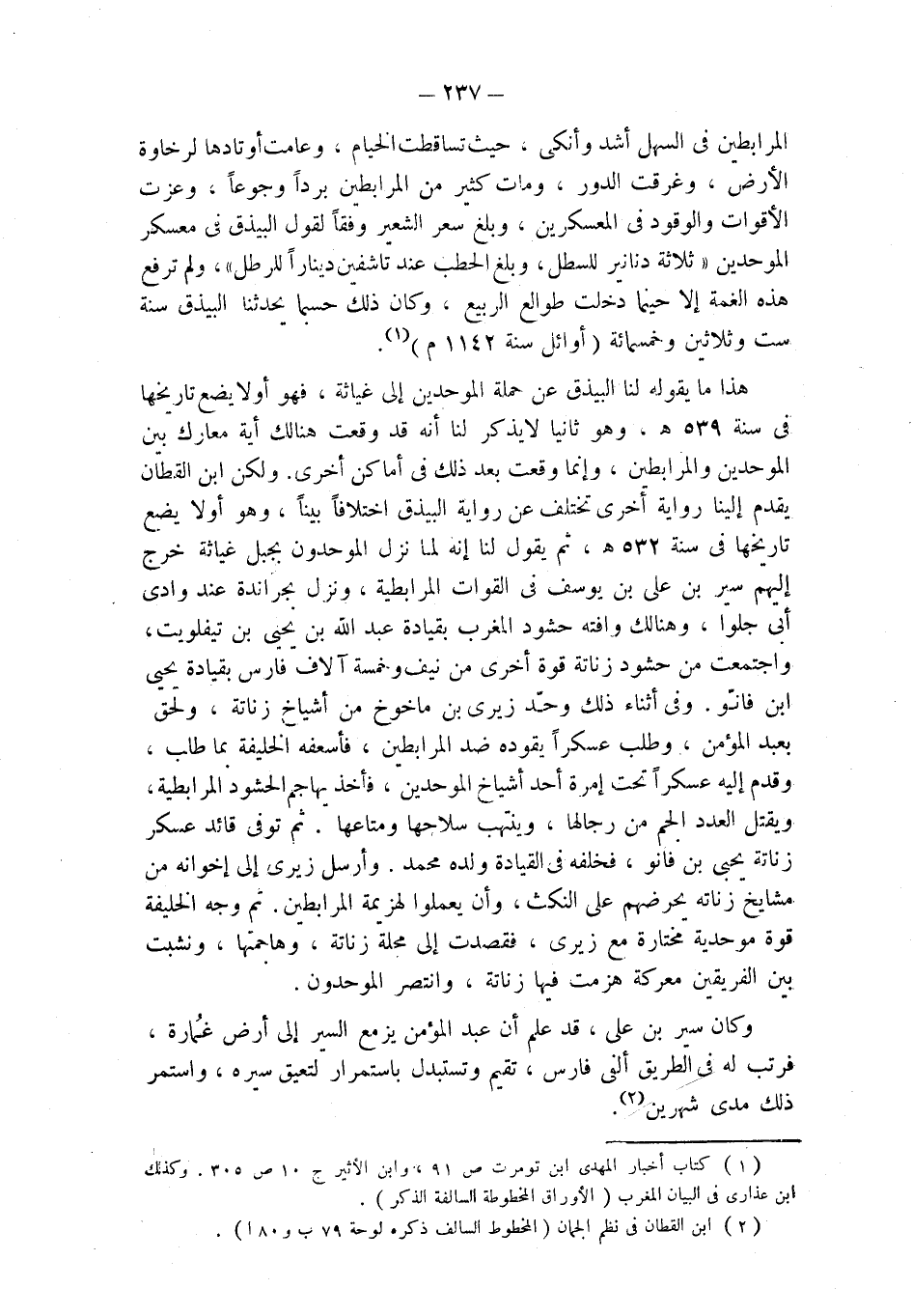 (¬1) كتاب أخبار المهدي ابن تومرت ص 91، وابن الأثير ج 10 ص 305. وكذلك ابن عذارى في البيان المغرب (الأوراق المخطوطة السالفة الذكر).