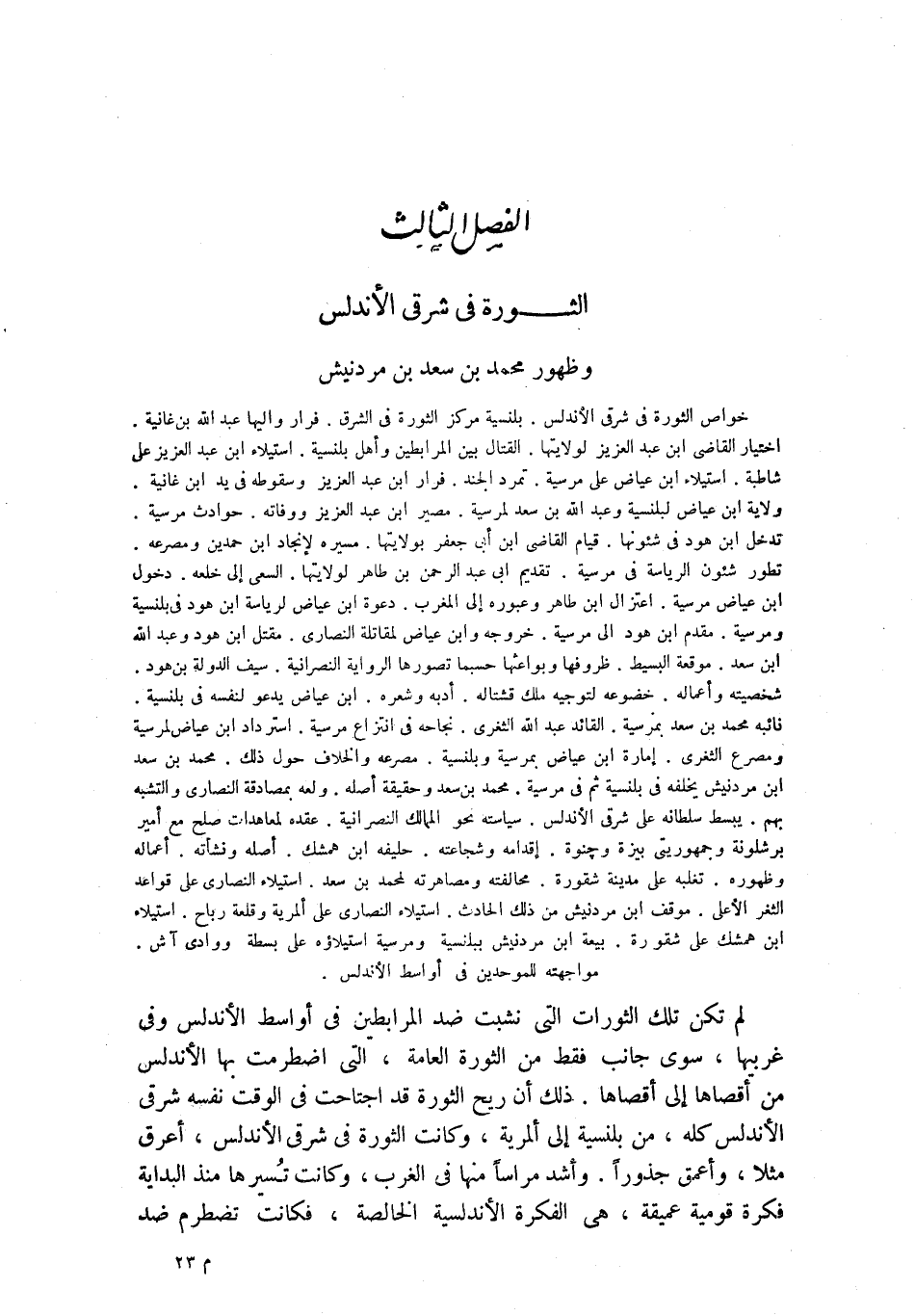 خواص الثورة في شرقي الأندلس. بلنسية مركز الثورة في الشرق. فرار واليها عبد الله بن غانية. اختيار القاضي ابن عبد العزيز لولايتها. القتال بين المرابطين أهل بلنسية. استيلاء ابن عبد العزيز على شاطبة. استيلاء ابن عياض على مرسية. تمرد الجند. فرار ابن عبد العزيز وسقوطه في يد ابن غانية. ولاية ابن عياض لبلنسية وعبد الله بن سعد لمرسية. مصير ابن عبد العزيز ووفاته. حوادث مرسية. تدخل ابن هود في شئونها. قيام القاضي ابن أبى جعفر بولايتها. مسيره لإنجاد ابن حمدين ومصرعه. تطور شئون الرياسة في مرسية. تقديم أبى عبد الرحمن بن طاهر لولايتها. السعي إلى خلعه. دخول ابن عياض مرسية. اعتزال ابن طاهر وعبوره إلى المغرب. دعوة ابن عياض لرياسة ابن هود في بلنسية ومرسية. مقدم ابن هود إلى مرسية. خروجه وابن عياض لمقاتلة النصارى. مقتل ابن هود وعبد الله ابن سعد. موقعة البسيط. ظروفها وبواعثها حسبما تصورها الرواية النصرانية. سيف الدولة بن هود. شخصيته وأعماله. خضوعه لتوجيه ملك قشتالة. أدبه وشعره. ابن عياض يدعو لنفسه في بلنسية. نائبه محمد بن سعد بمرسية. القائد عبد الله الثغري. نجاحه في انتزاع مرسية. استرداد ابن عياض لمرسية ومصرع الثغري. إمارة ابن عياض بمرسية وبلنسية. مصرعه والخلاف حول ذلك. محمد بن سعد ابن مردنيش يخلفه في بلنسية ثم في مرسية. محمد بن سعد وحقيقة أصله. ولعه بمصادقة النصارى والتشبه بهم. يبسط سلطانه على شرقي الأندلس. سياسته نحو الممالك النصرانية. عقده لمعاهدات صلح مع أمير برشلونة وجمهوريتي بيزة وجنوة. إقدامه وشجاعته. حليفه ابن همشك. أصله ونشأته. أعماله وظهوره. تغلبه على مدينة شقورة. محالفته ومصاهرته لمحمد بن سعد. استيلاء النصارى على قواعد الثغر الأعلى. موقف ابن مردنيش من ذلك الحادث. استيلاء النصارى على ألمرية وقلعة رباح. استيلاء ابن همشك على شقورة. بيعة ابن مردنيش ببلنسية ومرسية استيلاؤه على بسطة ووادي آش. مواجهته للموحدين في أواسط الأندلس.