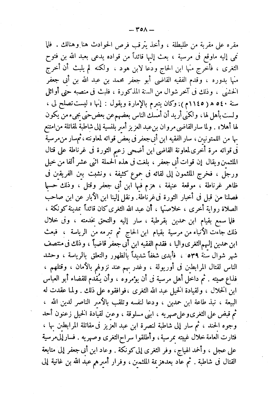 مقره على مقربة من طليطلة، وأخذ يترقب فرص الحوادث هنا وهنالك. فلما نمى إليه ما وقع في مرسية، بعث إليها قائداً من قواده يدعى بعبد الله بن فتوح الثغري، فأخرج منها ابن الحاج ودعا لابن هود، ولكنه لم يلبث أن أخرج منها بدوره، وقدم الفقيه القاضي أبو جعفر محمد بن عبد الله بن أبى جعفر الخشني، وذلك في آخر شوال من السنة المذكورة، فلبث في منصبه حتى أوائل سنة 540 هـ (1145 م)، وكان يتبرم بالإمارة ويقول: إنها " ليست تصلح لي، ولست بأهل لها، ولكني أريد أن أمسك الناس بعضهم عن بعض حتى يجىء من يكون لها أهلا ". ولما سار القاضي مروان بن عبد العزيز أمير بلنسية إلى شاطبة لمقاتلة من امتنع بها من اللمتونيين، سار الفقيه ابن أبى جعفر في بعض قواته لمعاونته "، ثم سار من مرسية في قواته مرة أخرى لمعاونة القاضي ابن أضحى زعيم الثورة في غرناطة على قتال الملثمين ويقال إن قوات أبى جعفر، بلغت في هذه الحملة اثنى عشر ألفاً من خيل ورجل، فخرج الملثمون إلى لقائه في جموع كثيفة، ونشبت بين الفريقين في ظاهر غرناطة، موقعة عنيفة، هزم فيها ابن أبى جعفر وقتل، وذلك حسبما فصلنا من قبل في أخبار الثورة في غرناطة. ونقل إلينا ابن الأبار عن ابن صاحب الصلاة رواية أخرى، خلاصتها، أن عبد الله الثغري كان قائداً بمدينة كونكة، فلما سمع بقيام ابن حمدين بقرطبة، سار إليه والتحق بخدمته، وفي خلال ذلك جاءت الأنباء من مرسية بقيام ابن الحاج ثم تبرمه من الرياسة، فبعث ابن حمدين إليهم الثغري والياً، فقدّم الفقيه ابن أبى جعفر قاضياً، وذلك في منتصف شهر شوال سنة 539 هـ، فأبدى شغفاً شديداً بالظهور والتعلق بالرياسة، وحشد الناس لقتال المرابطين في أوريولة، وغدر بهم عند نزولهم بالأمان، وقتلهم، فذاع صيته. ثم داخل أهل مرسية في أن يؤمروه، وأن يُقدم للقضاء أبو العباس ابن الخلال، ولقيادة الخيل عبد الله الثغري، فوافقوه على ذلك. ولما عقدت له البيعة، نبذ طاعة ابن حمدين، ودعا لنفسه وتلقب بالأمير الناصر لدين الله، ثم قبض على الثغري وعلى صهريه، ابني مسلوقة، وعين لقيادة الخيل زعنون أحد وجوه الجند، ثم سار إلى شاطبة لنصرة ابن عبد العزيز في مقاتلة المرابطين بها، فثارت العامة خلال غيبته بمرسية، وأطلقوا سراح الثغري وصهريه. فسار إلى مرسية على عجل، وأخمد الهياج، وفر الثغري إلى كونكة. وعاد ابن أبى جعفر إلى متابعة القتال في شاطبة. ثم عاد بعد هزيمة الملثمين، وفرار أميرهم عبد الله بن غانية إلى