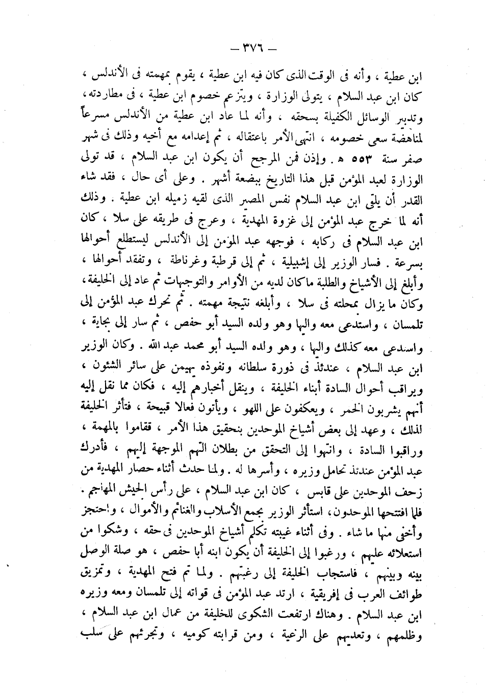 ابن عطية، وأنه في الوقت الذي كان فيه ابن عطية، يقوم بمهمته في الأندلس، كان ابن عبد السلام، يتولى الوزارة، ويتزعم خصوم ابن عطية، في مطاردته، وتدبير الوسائل الكفيلة بسحقه، وأنه لما عاد ابن عطية من الأندلس مسرعاً لمناهضة سعي خصومه، انتهى الأمر باعتقاله، ثم إعدامه مع أخيه وذلك في شهر صفر سنة 553 هـ. وإذن فمن المرجح أن يكون ابن عبد السلام، قد تولى الوزارة لعبد المؤمن قبل هذا التاريخ ببضعة أشهر. وعلى أي حال، فقد شاء القدر أن يلقي ابن عبد السلام نفس المصير الذي لقيه زميله ابن عطية. وذلك أنه لما خرج عبد المؤمن إلى غزوة المهدية، وعرج في طريقه على سلا، كان ابن عبد السلام في ركابه، فوجهه عبد المؤمن إلى الأندلس ليستطلع أحوالها بسرعة. فسار الوزير إلى إشبيلية، ثم إلى قرطبة وغرناطة، وتفقد أحوالها، وأبلغ إلى الأشياخ والطلبة ما كان لديه من الأوامر والتوجيهات ثم عاد إلى الخليفة، وكان ما يزال بمحلته في سلا، وأبلغه نتيجة مهمته. ثم تحرك عبد المؤمن إلى تلمسان، واستدعى معه واليها وهو ولده السيد أبو حفص، ثم سار إلى بجاية، واستدعى معه كذلك واليها، وهو ولده السيد أبو محمد عبد الله. وكان الوزير ابن عبد السلام، عندئذ في ذروة سلطانه ونفوذه يهيمن على سائر الشئون، ويراقب أحوال السادة أبناء الخليفة، وينقل أخبارهم إليه، وكان مما نقل إليه أنهم يشربون الخمر، ويعكفون على اللهو، ويأتون فعالا قبيحة، فتأثر الخليفة لذلك، وعهد إلى بعض أشياخ الموحدين بتحقيق هذا الأمر، فقاموا بالمهمة، وراقبوا السادة، وانتهوا إلى التحقق من بطلان التهم الموجهة إليهم، فأدرك عبد المؤمن عندئذ تحامل وزيره، وأسرها له. ولما حدث أثناء حصار المهدية من زحف الموحدين على قابس، كان ابن عبد السلام، على رأس الجيش المهاجم.