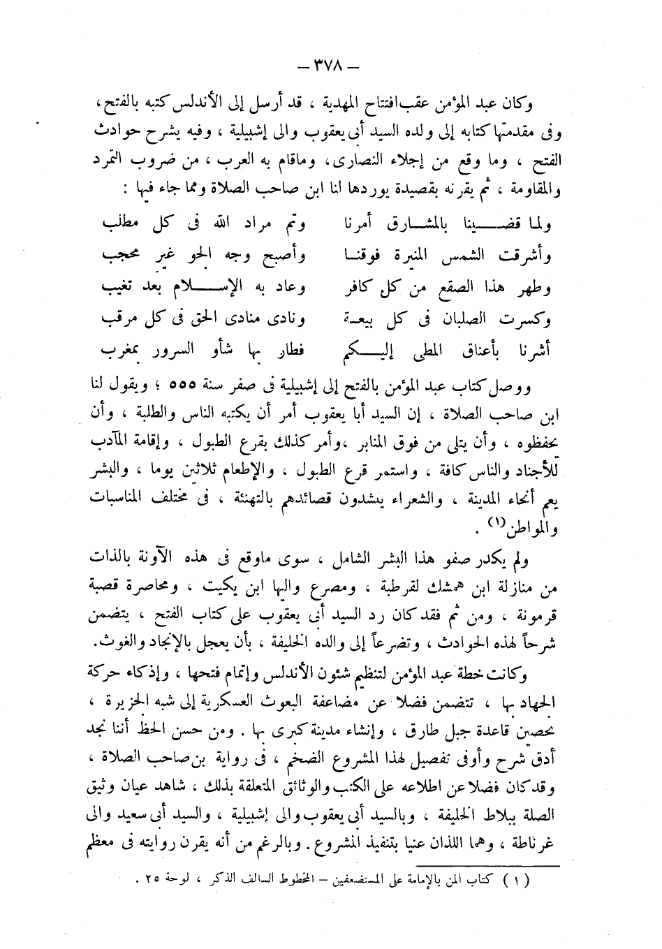 وكان عبد المؤمن عقب افتتاح المهدية، قد أرسل إلى الأندلس كتبه بالفتح، وفي مقدمتها كتابه إلى ولده السيد أبى يعقوب والى إشبيلية، وفيه يشرح حوادث الفتح، وما وقع من إجلاء النصارى، وما قام به العرب، من ضروب التمرد والمقاومة، ثم يقرنه بقصيدة يوردها لنا ابن صاحب الصلاة ومما جاء فيها: