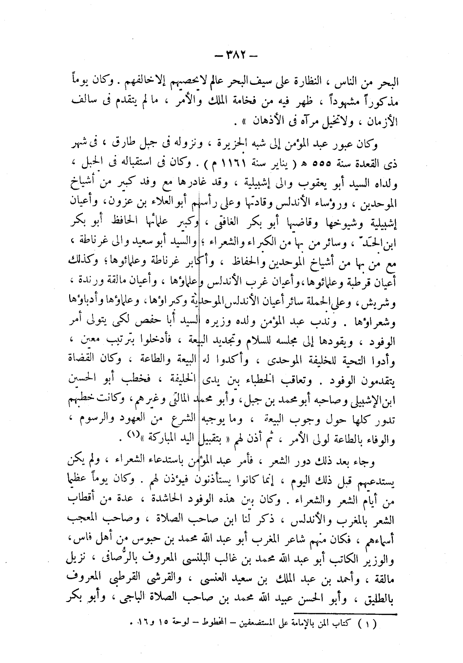 وكان عبور عبد المؤمن إلى شبه الجزيرة، ونزوله في جبل طارق، في شهر ذي القعدة سنة 555 هـ (يناير سنة 1161 م). وكان في استقباله في الجبل، ولداه السيد أبو يعقوب والى إشبيلية، وقد غادرها مع وفد كبير من أشياخ الموحدين، ورؤساء الأندلس وقادتها وعلى رأسهم أبو العلاء بن عزون، وأعيان إشبيلية وشيوخها وقاضيها أبو بكر الغافقي، وكبير علمائها الحافظ أبو بكر ابن الجَدّ، وسائر من بها من الكبراء والشعراء؛ والسيد أبو سعيد والي غرناطة، مع من بها من أشياخ الموحدين والحفاظ، وأكابر غرناطة وعلماؤها، وكذلك أعيان قرطبة وعلماؤها، وأعيان غرب الأندلس وعلماؤها؛ وأعيان مالقة ورندة، وشريش، وعلى الجملة سائر أعيان الأندلس الموحدية وكبراؤها، وعلماؤها وأدباؤها وشعراؤها. وندب عبد المؤمن ولده ووزيره السيد أبا حفص لكي يتولى أمر الوفود، ويقودها إلى مجلسه للسلام وتجديد البيعة، فأدخلوا بترتيب معين، وأدوا التحية للخليفة الموحدي، وأكدوا له البيعة والطاعة، وكان القضاة يتقدمون الوفود. وتعاقب الخطباء بين يدي الخليفة، فخطب أبو الحسين ابن الإشبيلي وصاحبه أبو محمد بن جبل، وأبو محمد المالقي وغيرهم، وكانت خطبهم تدور كلها حول وجوب البيعة، وما يوجبه الشرع من العهود والرسوم، والوفاء بالطاعة لولي الأمر، ثم أذن لهم " بتقبيل اليد المباركة " (¬1).