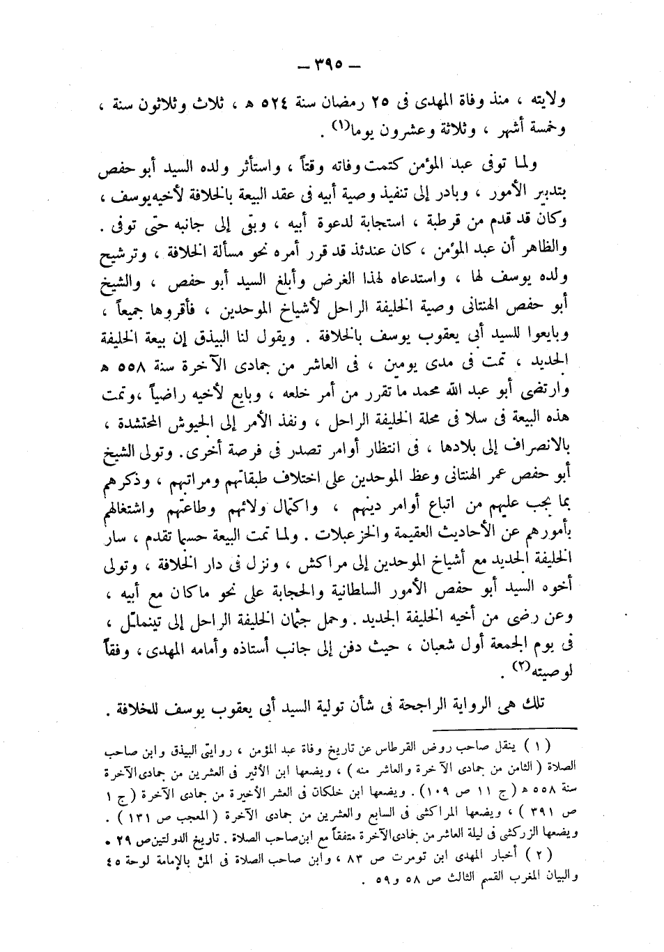 (¬1) ينقل صاحب روض القرطاس عن تاريخ وفاة عبد المؤمن، روايتي البيذق وابن صاحب الصلاة (الثامن من جمادى الآخرة والعاشر منه)، ويضعها ابن الأثير في العشرين من جمادى الآخرة سنة 558 هـ (ج 11 ص 109). ويضعها ابن خلكان في العشر الأخيرة من جمادى الآخرة (ج 1 ص 391)، ويضعها المراكشي في السابع والعشرين من جمادى الآخرة (المعجب ص 131).