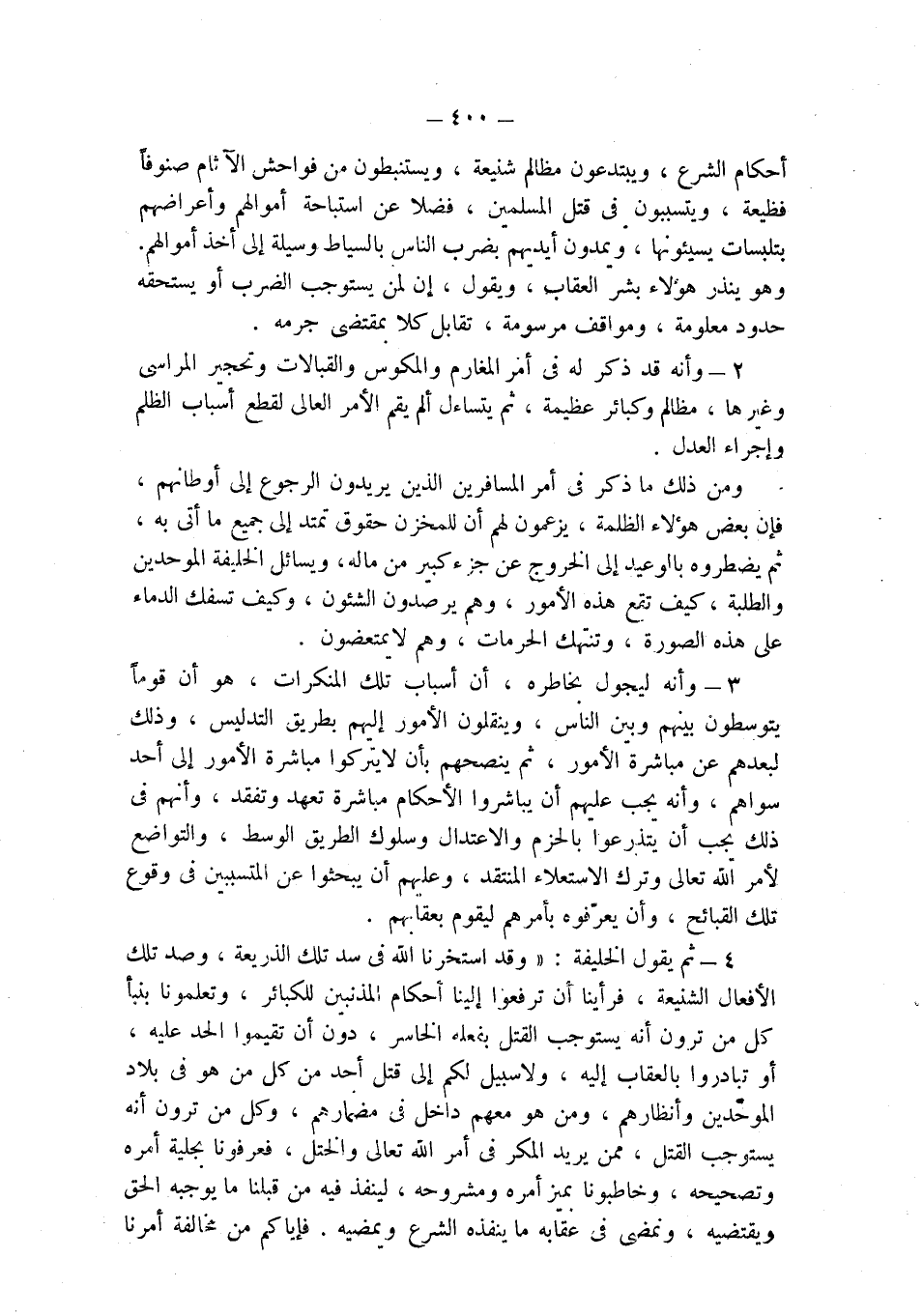 4 - ثم يقول الخليفة: " وقد استخرنا الله في سد تلك الذريعة، وصد تلك الأفعال الشنيعة، فرأينا أن ترفعوا إلينا أحكام المذنبين للكبائر، وتعلمونا بنبأ كل من ترون أنه يستوجب القتل بفعله الخاسر، دون أن تقيموا الحد عليه، أو تبادروا بالعقاب إليه، ولا سبيل لكم إلى قتل أحد من كل من هو في بلاد الموحدين وأنظارهم، ومن هو معهم داخل مضمارهم، وكل من ترون أنه يستوجب القتل، ممن يريد المكر في أمر الله تعالى والختل، فعرفونا بجلية أمره وتصحيحه، وخاطبونا بميز أمره ومشروحه، لينفذ فيه من قبلنا ما يوجبه الحق ويقتضيه، ونمضي في عقابه ما ينفذه الشرع ويمضيه. فإياكم من مخالفة أمرنا