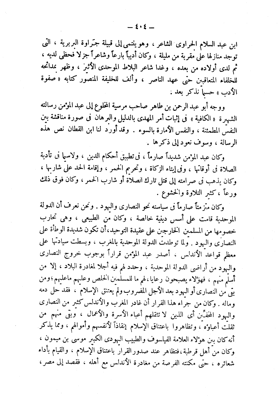 ووجه أبو عبد الرحمن بن طاهر صاحب مرسية المخلوع إلى عبد المؤمن رسالته الشهيرة " الكافية " في إثبات أمر المهدي بالدليل والبرهان في صورة مناقشة بين النفس المطمئنة، والنفس الأمارة بالسوء. وقد أورد لنا ابن القطان نص هذه الرسالة، وسوف نعود إلى ذكرها.