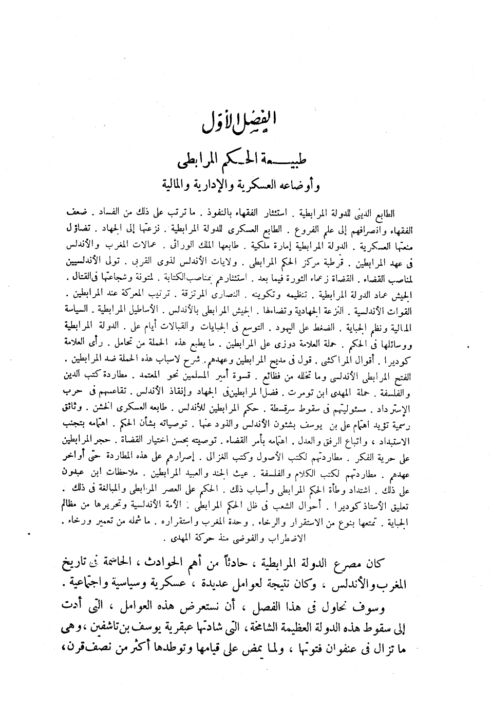 الطابع الديني للدولة المرابطية. استئثار الفقهاء بالنفوذ. ما ترتب على ذلك من الفساد. ضعف الفقهاء وانصرافهم إلى علم الفروع. الطابع العسكري للدولة المرابطية. نزعتها إلى الجهاد. تضاؤل منعتها العسكرية. الدولة المرابطية إمارة ملكية. طابعها الملك الوراثي. عمالات المغرب والأندلس في عهد المرابطين. قرطبة مركز الحكم المرابطي. ولايات الأندلس لذوي القربى. تولى الأندلسيين لمناصب القضاء. القضاة زعماء الثورة فيما بعد. استئثارهم بمناصب الكتابة. لمتونة وشجاعتها في القتال. الجيش عماد الدولة المرابطية. تنظيمه وتكوينه. النصارى المرتزقة. ترتيب المعركة عند المرابطين. القوات الأندلسية. النزعة الجهادية وتضاءلها. الجيش المرابطي بالأندلس. الأساطيل المرابطية. السياسة المالية ونظم الجباية. الضغط على اليهود. التوسع في الجبايات والقبالات أيام علي. الدولة المرابطية ووسائلها في الحكم. حملة العلامة دوزي على المرابطين. ما يطبع هذه الحملة من تحامل. رأى العلامة كوديرا. أقوال المراكشي. قول في مديح المرابطين وعهدهم. شرح لأسباب هذه الحملة ضد المرابطين. الفتح المرابطي الأندلسي وما تخلله من فظائع. قسوة أمير المسلمين نحو المعتمد. مطاردة كتب الدين والفلسفة. حملة المهدي ابن تومرت. فضل المرابطين في الجهاد وإنقاذ الأندلس. تقاعسهم في حرب الإسترداد. مسئوليتهم في سقوط سرقسطة. حكم المرابطين للأندلس. طابعه العسكري الخشن. وثائق رسمية تؤيد اهتمام علي بن يوسف بشئون الأندلس والذود عنها. توصياته بشأن الحكم. اهتمامه بتجنب الاستبداد، واتباع الرفق والعدل. اهتمامه بأمر القضاء. توصيته بحسن اختيار القضاة. حجر المرابطين على حرية الفكر. مطاردتهم لكتب الأصول وكتب الغزالي. إصرارهم على هذه المطاردة حتى أواخر عهدهم. مطاردتهم لكتب الكلام والفلسفة. عيث الجند والعبيد المرابطين. ملاحظات ابن عبدون على ذلك. اشتداد وطأة الحكم المرابطي وأسباب ذلك. الحكم على العصر المرابطي والمبالغة في ذلك. تعليق الأستاذ كوديرا. أحوال الشعب في ظل الحكم المرابطي. الأمة الأندلسية وتحريرها من مظالم الجباية. تمتعها بنوع من الاستقرار والرخاء. وحدة المغرب واستقراره. ما شمله من تعمير ورخاء. الاضطراب والفوضى منذ حركة المهدي.