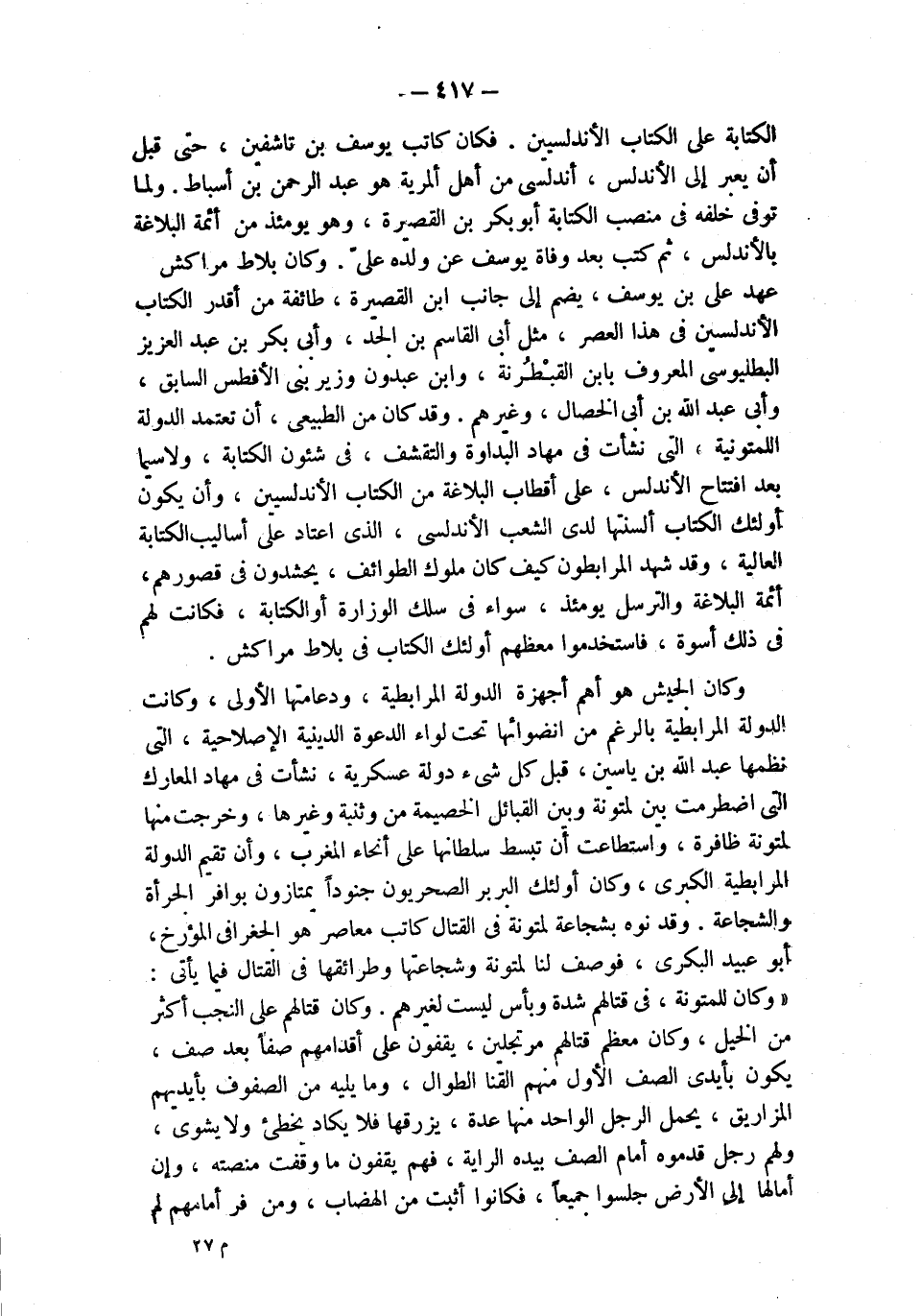 الكتابة على الكتاب الأندلسيين. فكان كاتب يوسف بن تاشفين، حتى قبل أن يعبر إلى الأندلس، أندلسي من أهل ألمرية هو عبد الرحمن بن أسباط. ولما توفي خلفه في منصب الكتابة أبو بكر بن القصيرة، وهو يومئذ من أئمة البلاغة بالأندلس، ثم كتب بعد وفاة يوسف عن ولده علي. وكان بلاط مراكش في عهد علي بن يوسف، يضم إلى جانب ابن القصيرة، طائفة من أقدر الكتاب الأندلسيين في هذا العصر، مثل أبى القاسم بن الجد، وأبى بكر بن عبد العزيز البطليوسي المعروف بابن القبْطُرنة، وابن عبدون وزير بني الأفطس السابق، وأبى عبد الله بن أبى الخصال، وغيرهم. وقد كان من الطبيعي، أن تعتمد الدولة اللمتونية، التي نشأت في مهاد البداوة والتقشف، في شئون الكتابة، ولاسيما بعد افتتاح الأندلس، على أقطاب البلاغة من الكتاب الأندلسيين، وأن يكون أولئك الكتاب ألسنتها لدى الشعب الأندلسي، الذي اعتاد على أساليب الكتابة العالية، وقد شهد المرابطون كيف كان ملوك الطوائف، يحشدون في قصورهم، أئمة البلاغة والترسل يومئذ، سواء في سلك الوزارة أو الكتابة، فكانت لهم في ذلك أسوة، فاستخدموا معظم أولئك الكتاب في بلاط مراكش.
