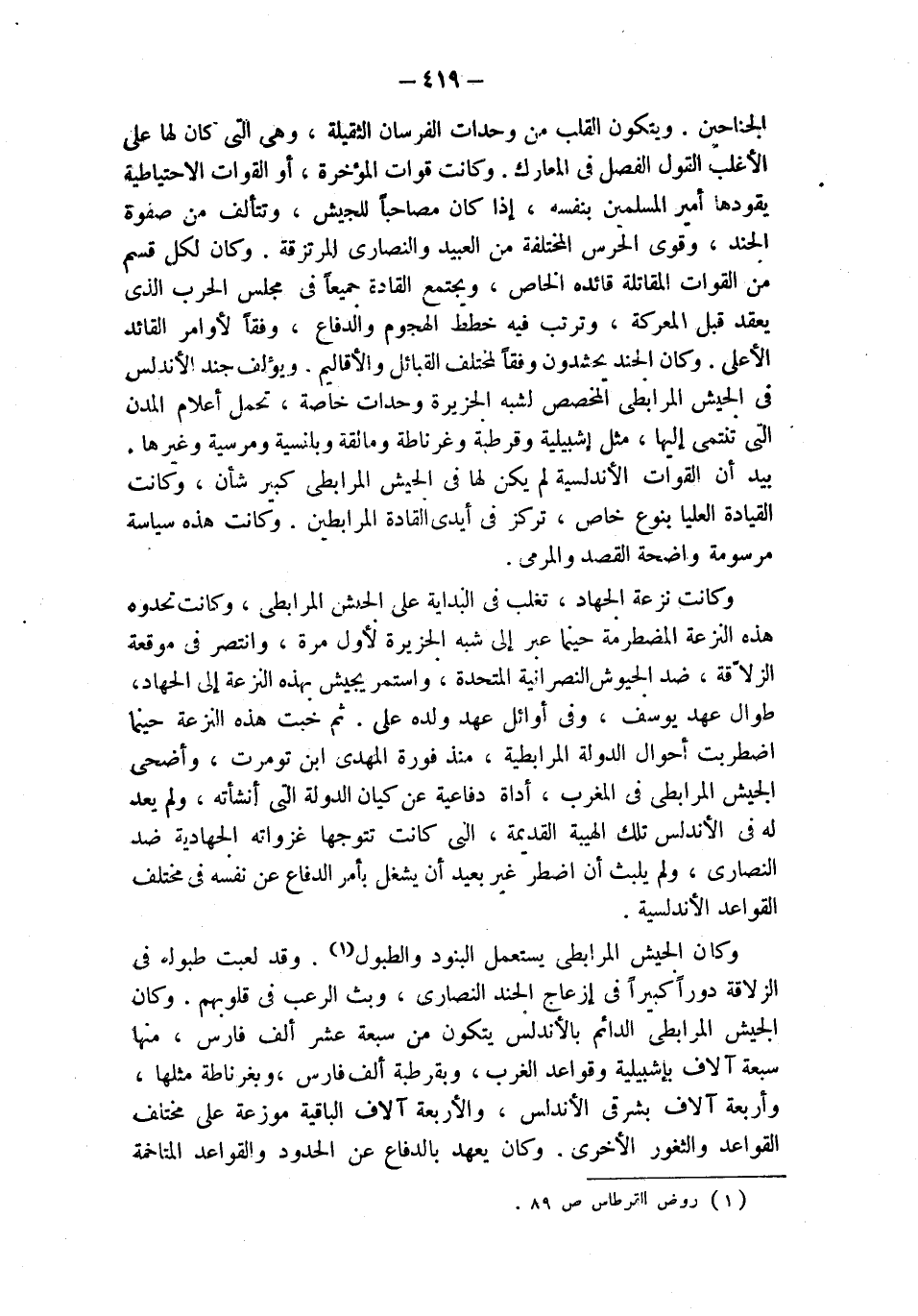 وكان الجيش المرابطي يستعمل البنود والطبول (¬1). وقد لعبت طبوله في الزلاّقة دوراً كبيراً في إزعاج الجند النصارى، وبث الرعب في قلوبهم. وكان الجيش المرابطي الدائم بالأندلس يتكون من سبعة عشر ألف فارس، منها سبعة آلاف بإشبيلية وقواعد الغرب، وبقرطبة ألف فارس، وبغرناطة مثلها، وأربعة آلاف بشرقي الأندلس، والأربعة آلاف الباقية موزعة على مختلف القواعد والثغور الأخرى، وكان يعهد بالدفاع عن الحدود والقواعد المتاخمة