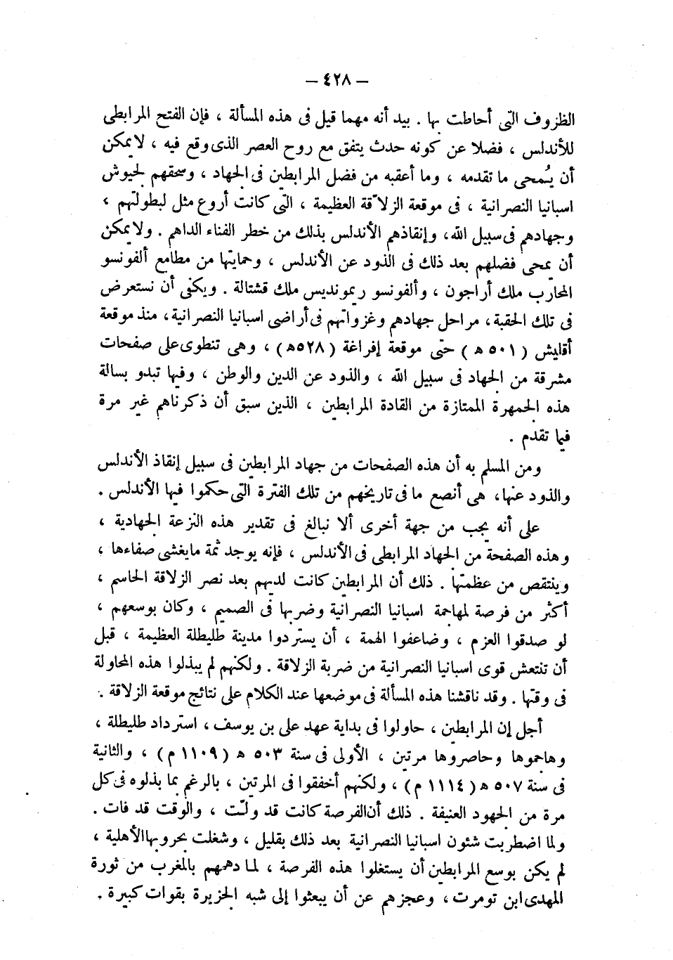 الظروف التي أحاطت بها. بيد أنه مهما قيل في هذه المسألة، فإن الفتح المرابطي للأندلس، فضلا عن كونه حدث يتفق مع روح العصر الذي وقع فيه، لا يمكن أن يُمحي ما تقدمه، وما أعقبه من فضل المرابطين في الجهاد، وسحقهم لجيوش اسبانيا النصرانية، في موقعة الزلاّقة العظيمة، التي كانت أروع مثل لبطولتهم، وجهادهم في سبيل الله، وإنقاذهم الأندلس بذلك من خطر الفناء الداهم. ولا يمكن أن يمحى فضلهم بعد ذلك في الذود عن الأندلس، وحمايتها من مطامع ألفونسو المحارب ملك أراجون، وألفونسو ريمونديس ملك قشتالة. ويكفي أن نستعرض في تلك الحقبة، مراحل جهادهم وغزواتهم في أراضي اسبانيا النصرانية، منذ موقعة أقليش (501 هـ) حتى موقعة إفراغة (528 هـ)، وهي تنطوي على صفحات مشرقة من الجهاد في سبيل الله، والذود عن الدين والوطن، وفيها تبدو بسالة هذه الجمهرة الممتازة من القادة المرابطين، الذين سبق أن ذكرناهم غير مرة فيما تقدم.