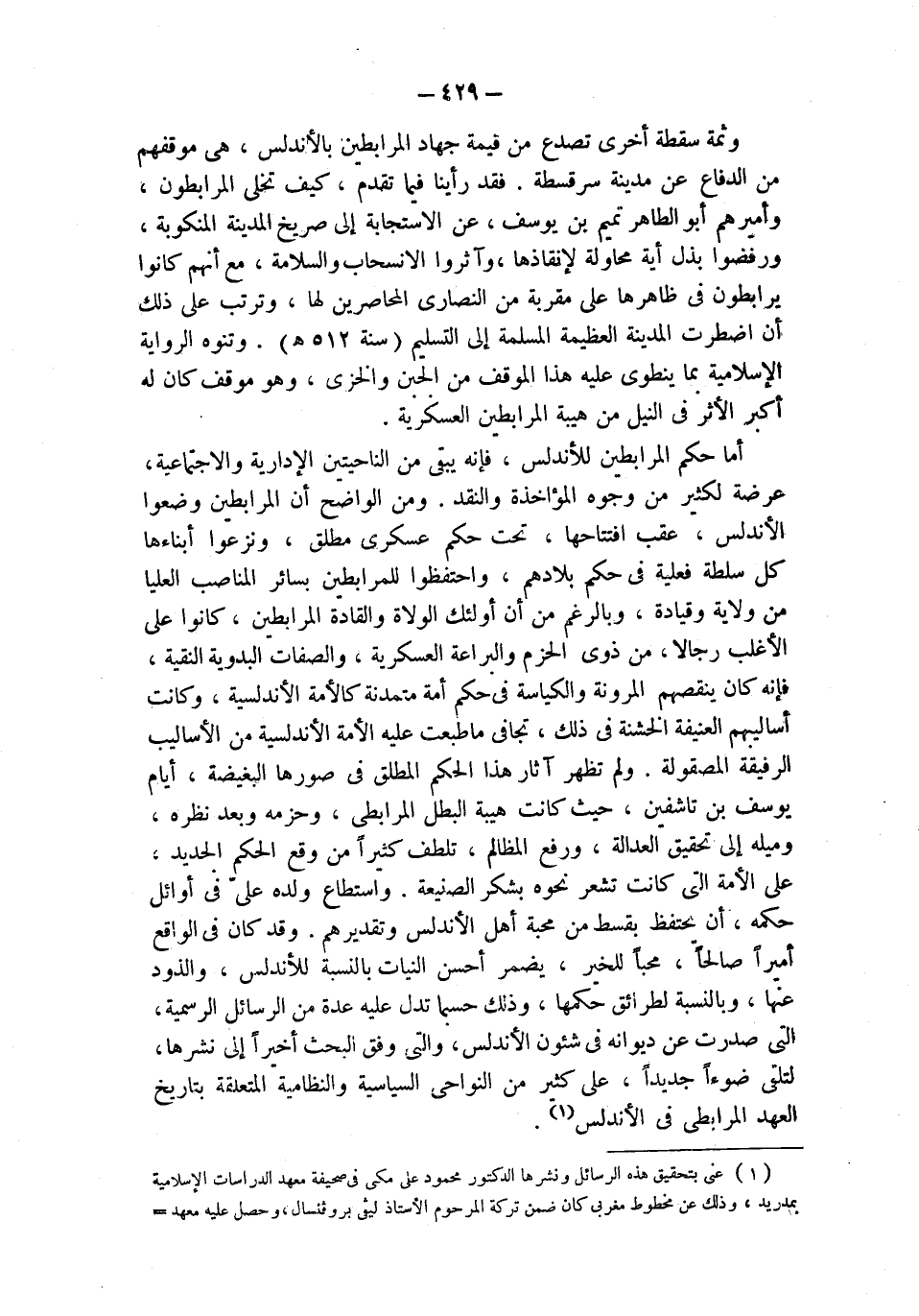 أما حكم المرابطين للأندلس، فإنه يبقى من الناحيتين الإدارية والاجتماعية، عرضة لكثير من وجوه المؤاخذة والنقد. ومن الواضح أن المرابطين وضعوا الأندلس، عقب افتتاحها، تحت حكم عسكري مطلق، ونزعوا أبناءها كل سلطة فعلية في حكم بلادهم، واحتفظوا للمرابطين بسائر المناصب العليا من ولاية وقيادة، وبالرغم من أن أولئك الولاة والقادة المرابطين، كانوا على الأغلب رجالا، من ذوي الحزم والبراعة العسكرية، والصفات البدوية النقية، فإنه كان ينقصهم المرونة والكياسة في حكم أمة متمدنة كالأمة الأندلسية، وكانت أساليبهم العنيفة الخشنة في ذلك، تجافى ما طبعت عليه الأمة الأندلسية من الأساليب الرفيقة المصقولة. ولم تظهر آثار هذا الحكم المطلق في صورها البغيضة، أيام يوسف بن تاشفين، حيث كانت هيبة البطل المرابطي، وحزمه وبعد نظره، وميله إلى تحقيق العدالة، ورفع المظالم، تلطف كثيراً من وقع الحكم الجديد، على الأمة التي كانت تشعر نحوه بشكر الصنيعة. واستطاع ولده على في أوائل حكمه، أن يحتفظ بقسط من محبة أهل الأندلس وتقديرهم. وقد كان في الواقع أميراً صالحاً، محباً للخير، يضمر أحسن النيات بالنسبة للأندلس، والذود عنها، وبالنسبة لطرائق حكمها، وذلك حسبما تدل عليه عدة من الرسائل الرسمية، التي صدرت عن ديوانه في شئون الأندلس، والتي وفق البحث أخيراً إن نشرها، لتلقي ضوءاً جديداً، على كثير من النواحي السياسية والنظامية المتعلقة بتاريخ العهد المرابطي في الأندلس (¬1).