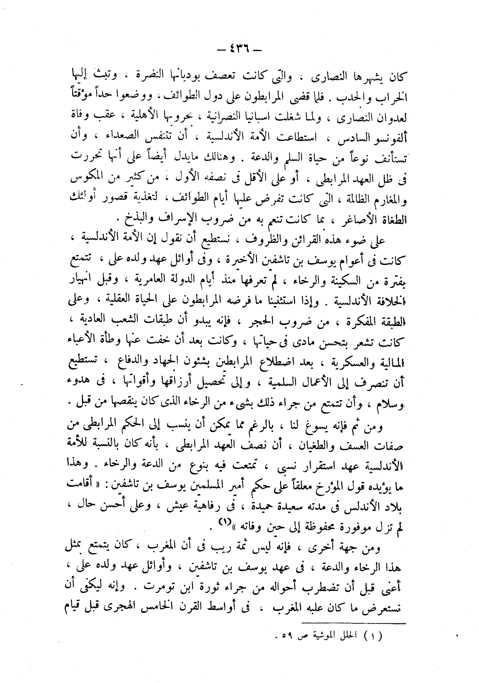 كان يشهرها النصارى، والتي كانت تعصف بوديانها النضرة، وتبث إليها الخراب والجدب. فلما قضى المرابطون على دول الطوائف، ووضعوا حداً مؤقتاً لعدوان النصارى، ولما شغلت اسبانيا النصرانية، بحروبها الأهلية، عقب وفاة ألفونسو السادس، استطاعت الأمة الأندلسية، أن تتنفس الصعداء، وأن تستأنف نوعاً من حياة السلم والدعة. وهنالك ما يدل أيضاً على أنها تحررت في ظل العهد المرابطي، أو على الأقل في نصفه الأول، من كثير من المكوس والمغارم الظالمة، التي كانت تفرض عليها أيام الطوائف، لتغذية قصور أولئك الطغاة الأصاغر، بما كانت تنعم به من ضروب الإسراف والبذخ.