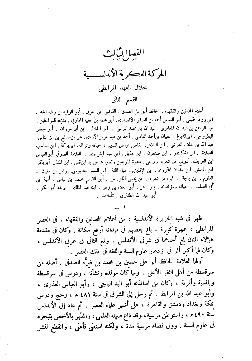 أعلام المحدثين والفقهاء. الحافظ أبو على الصدفي. القاضي ابن العربي. أبو الوليد بن رشد الجد. ابن ورد التميمي. أبو العباس أحمد بن الصقر الأنصاري. أبو محمد بن عطيه المحاربي. مديحه للمرابطين. عبد الرحمن بن عبد الله المعافري. عبد الله بن محمد المرسى. ابن الحلال. ابن أبى مروان. أبو جعفر البطروجي. ابن الدباغ. سفيان بن أحمد العاصي. أحمد بن عبد العزيز الأزدي. علي بن صالح بن عز الناس. عبد الله بن خلف القرشي. ابن الباذش. القاضي عياض السبتي، حياته وتراثه. ابن بركة. ابن صاحب الصلاة. ابن اشكبندر. ابن صنعون. ابن هذيل. ابن سيد الجراوي. العلامة الصوفي أبو العباس ابن العريف. نموذج من شعره الروحي. دعوة المريدين وتطورها على يد ابن قسي. ابن المنذر. أبو بكر ابن المنخل. ابن سفيان المخزومي. ابن الإقليشي. علماء اللغة. ابن السيد البطليوسي. يونس بن مغيث. العلوم. ابن باجة. شىء من شعره. ابن يحيى الخزرجي. أبو القاسم خلف بن عباس. أمية بن أبى الصلت. حياته ومؤلفاته. بنو زهر. أبو العلاء بن زهر. ابنه عبد الملك. ولده أبو بكر. أبو عبد الله الطغنري. تأملات.