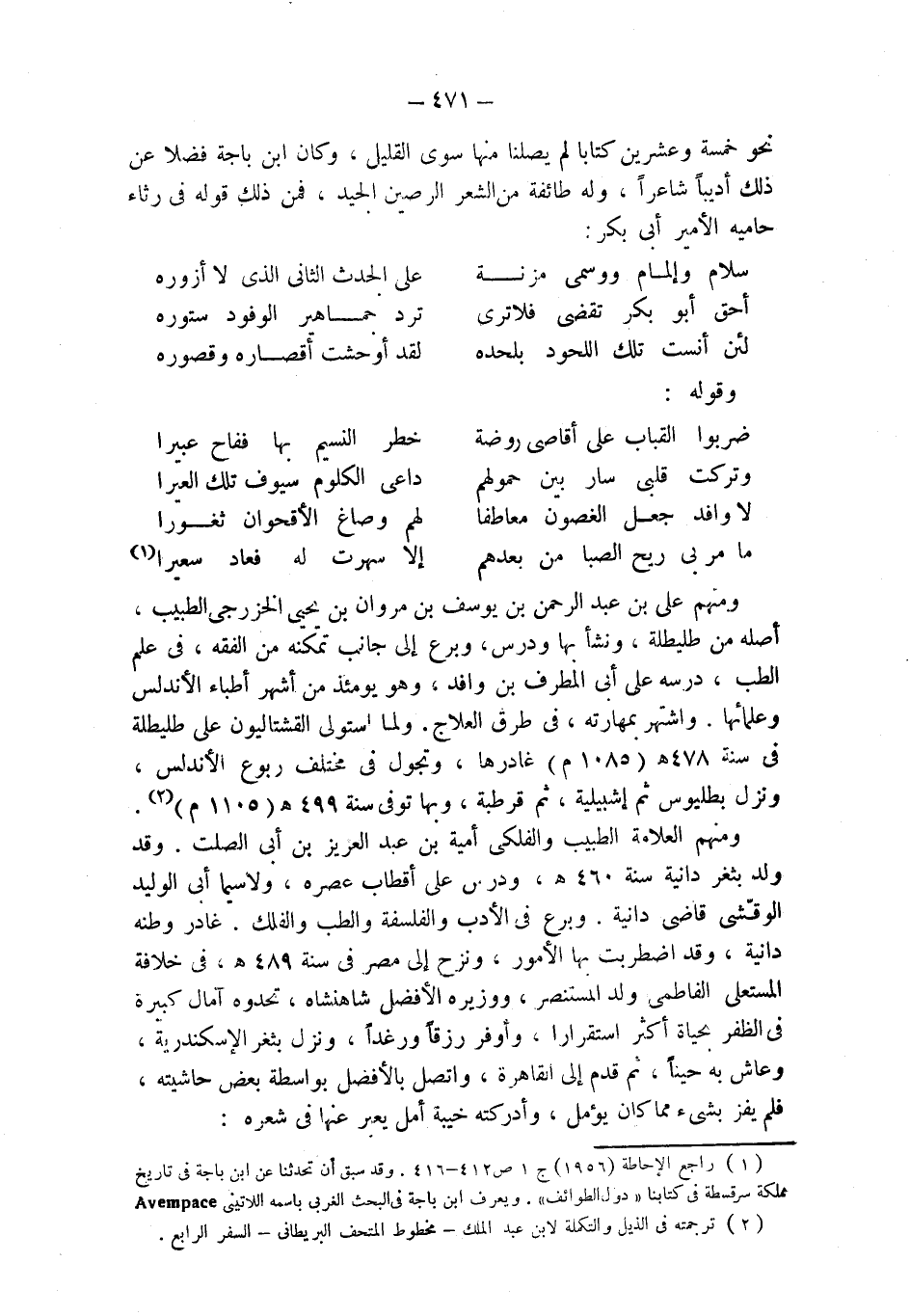 (¬1) راجع الإحاطة (1956) ج 1 ص 412 - 416. وقد سبق أن تحدثنا عن ابن باجة في تاريخ مملكة سرقسطة في كتابنا " دول الطوائف ". ويعرف ابن باجة في البحث الغربي باسمه اللاتيني Avempace