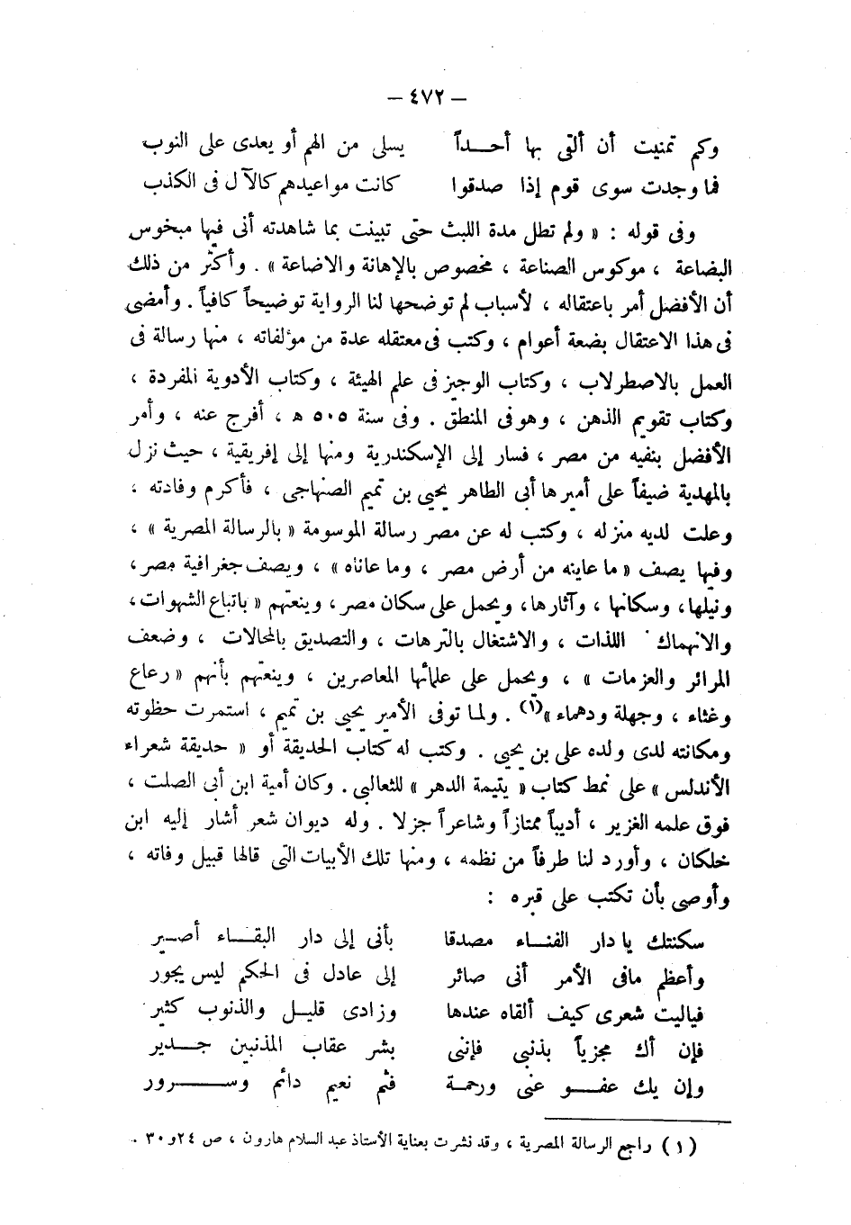 وفي قوله: " ولم تطل مدة اللبث حتى تبينت بما شاهدته أني فيها مبخوس البضاعة، موكوس الصناعة، مخصوص بالإهانة والإضاعة ". وأكثر من ذلك أن الأفضل أمر باعتقاله، لأسباب لم توضحها لنا الرواية توضيحاً كافياً. وأمضى في هذا الاعتقال بضعة أعوام، وكتب في معتقله عدة من مؤلفاته، منها رسالة في العمل بالاصطرلاب، وكتاب الوجيز في علم الهيئة، وكتاب الأدوية المفردة، وكتاب تقويم الذهن، وهو في المنطق. وفي سنة 505 هـ، أفرج عنه، وأمر الأفضل بنفيه من مصر، فسار إلى الإسكندرية ومنها إلى إفريقية، حيث نزل بالمهدية ضيفاً على أميرها أبى الطاهر يحيى بن تميم الصنهاجي، فأكرم وفادته، وعلت لديه منزله، وكتب له عن مصر رسالته الموسومة " بالرسالة المصرية "، وفيها يصف " ما عاينه من أرض مصر، وما عاناه "، ويصف جغرافية مصر، ونيلها، وسكانها، وآثارها، ويحمل على سكان مصر، وينعتهم " باتباع الشهوات، والانهماك في اللذات، والاشتغال بالترهات، والتصديق بالمحالات، وضعف المرائر والعزمات "، ويحمل على علمائها المعاصرين، وينعتهم بأنهم " رعاع وغثاء، وجهلة ودهماء " (¬1). ولما توفي الأمير يحيى بن تميم، استمرت حظوته ومكانته لدى ولده علي بن يحيى. وكتب له كتاب الحديقة أو " حديقة شعراء الأندلس " على نمط كتاب " يتيمة الدهر " للثعالبي. وكان أمية ابن أبى الصلت، فوق علمه الغزير، أديباً ممتازاً وشاعراً جزلا. وله ديوان شعر أشار إليه ابن خلكان، وأورد لنا طرفاً من نظمه، ومنها تلك الأبيات التي قالها قبيل وفاته، وأوصى بأن تكتب على قبره: