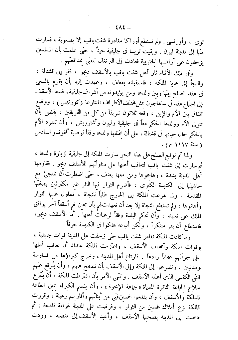 ولما تم توقيع الصلح على هذا النحو سارت الملكة إلى جليقية لزيارة ولدها، ثم سارت إلى شنت ياقب لتعاقب أهلها على مناوأتهم للأسقف ديجو. فقاومها أهل المدينة بشدة، وهاجموها ومن معها بعنف، حتى اضطرت أن تلتجىء مع حاشيتها إلى الكنيسة الكبرى، فأضرم الثوار فيها النار غير مكترثين بصفتها المقدسة، ولما هرعت الملكة إلى الخارج طلباً للنجاة، تطاول عليها الثوار وأهانوها، ولم تستطع النجاة إلا بعد أن تعهدت لهم بأن تعين لهم أسقفاً آخر يوافق ْالملك على تعيينه، وأن تحكم البلدة وفقاً لرغبات أهلها. أما الأسقف ديجو، فاستطاع أن يفر متنكراً، ولكن أتباعه هلكوا في الكنيسة حرقاً.
