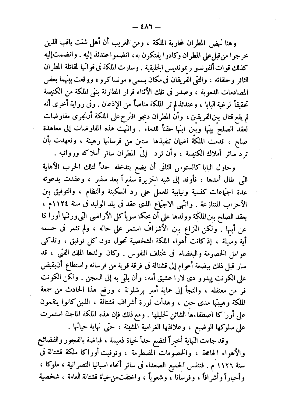 وقد جاءت النهاية أخيراً لتضع حداً لحياة ذميمة، فياضة بالفجور والفضائح والأهواء الجامحة، والخصومات المضطرمة، وتوفيت أوراكا ملكة قشتالة في سنة 1126 م. فتنفس الجميع الصعداء في سائر أنحاء اسبانيا النصرانية، ملوكاً، وأحباراً وأشرافاً، وفرساناً، وشعوباً، واختفت من حياة قشتالة العامة، شخصية