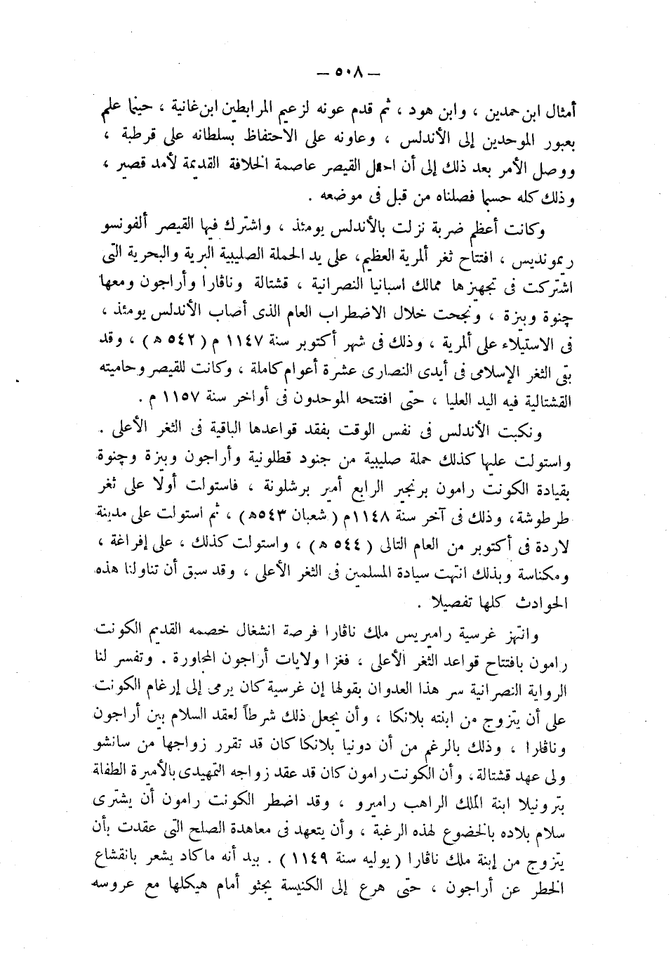 أمثال ابن حمدين، وابن هود، ثم قدم عونه لزعيم المرابطين ابن غانية، حينما علم بعبور الموحدين إلى الأندلس، وعاونه على الاحتفاظ بسلطانه على قرطبة، ووصل الأمر بعد ذلك إلى أن احتل القيصر عاصمة الخلافة القديمة لأمد قصير، وذلك كله حسبما فصلناه من قبل في موضعه.
