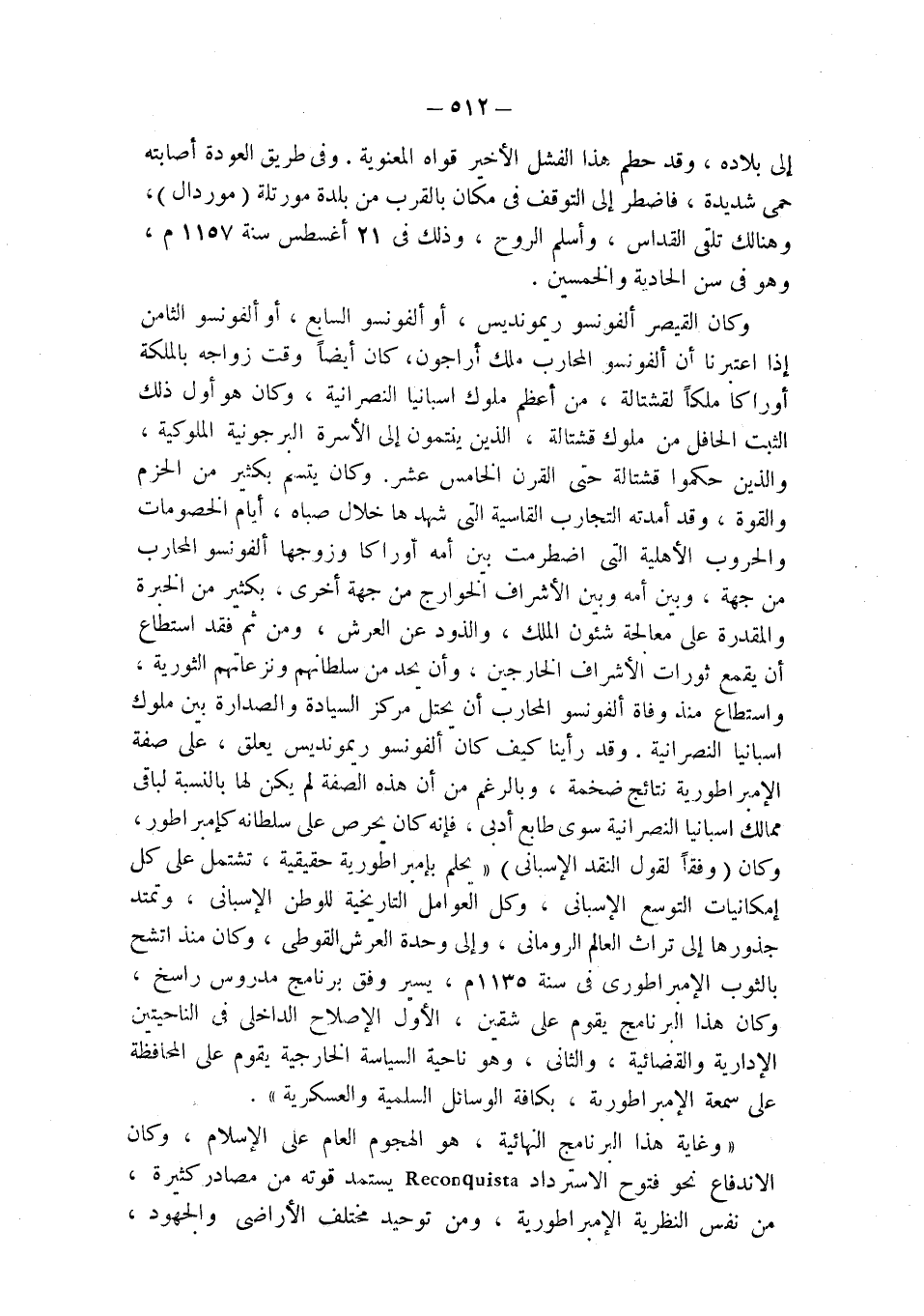 " وغاية هذا البرنامج النهائية، هو الهجوم العام على الإسلام، وكان الاندفاع نحو فتوح الاسترداد Reconquista يستمد قوته من مصادر كثيرة، من نفس النظرية الإمبراطورية، ومن توحيد مختلف الأراضي والجهود،