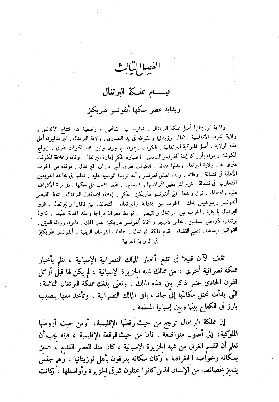 ولاية لوزيتانيا أصل مملكة البرتغال. تداولها بين الفاتحين، وضعها عند افتتاح الأندلس. ولاية الغرب الأندلسية. شمال لوزيتانيا وسقوطه في يد النصارى. ولاية البرتغال. البرتغاليون أهل هذه الولاية. أصل الملوكية البرتغالية. الكونت ريمون البرجوني وابن عمه الكونت هنري. زواج الكونت ريمون بأوراكا إبنة ألفونسو السادس. اختياره لحكم إمارة البرتغال. وفاته وخلافة الكونت هنري له. ولاية البرتغال ومدنها عندئذ. الكونت هنري أمير وراثي للبرتغال. موقفه من الحرب الأهلية في قشتالة. وفاته. ولده الطفل ألفونسو وأمه تريسا الوصية عليه. تقلبها في محالفة الفريقين المتحاربين في قشتالة. غزو المرابطين لأراضيها وانسحابهم. سخط الشعب على حكمها. مؤامرة الأشراف عليها واعتقالها. تولى ولدها الفتى ألفونسو هنريكيز الحكم. إعلانه لاستقلال البرتغال. سخط القيصر ألفونسو ريمونديس لذلك. الحرب بين قشتالة والبرتغال. التحالف بين نافارا والبرتغال. غزو البرتغال لجليقية. الحرب بين البرتغال والقيصر. توسط مطران براجا وعقد الهدنة بينهما. غزوة برتغالية لأراضي المسلمين. مجلس لاميجو واتخاذ ألفونسو هنريكيز لقب الملك. قانون وراثة العرش. القوانين الجديدة. تنظيم القضاء. قيام مملكة البرتغال. جماعات الفرسان الدينية. ألفونسو هنريكيز في الرواية العربية.