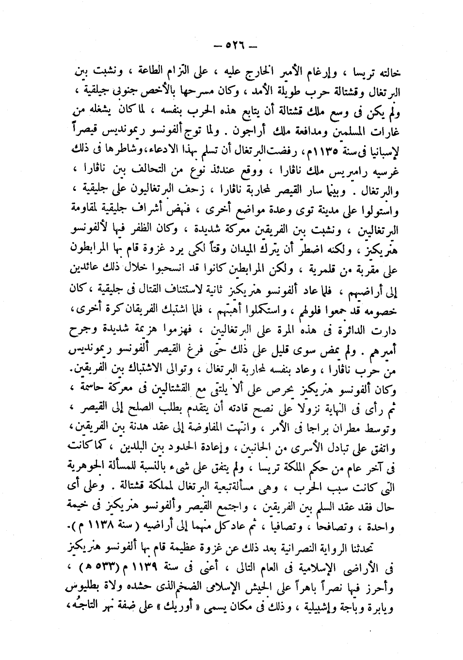 خالته تريسا، وإرغام الأمير الخارج عليه، على التزام الطاعة، ونشبت بين البرتغال وقشتالة حرب طويلة الأمد، وكان مسرحها بالأخص جنوبي جيلقية، ولم يكن في وسع ملك قشتالة أن يتابع هذه الحرب بنفسه، لما كان يشغله من غارات المسلمين ومدافعة ملك أراجون. ولما توج ألفونسو ريمونديس قيصراً لإسبانيا في سنة 1135 م، رفضت البرتغال أن تسلم بهذا الادعاء، وشاطرها في ذلك غرسيه راميريس ملك نافارا، ووقع عندئذ نوع من التحالف بين نافارا، والبرتغال. وبينما سار القيصر لمحاربة نافارا، زحف البرتغاليون على جليقية، واستولوا على مدينة توي وعدة مواضع أخرى، فنهض أشراف جليقية لمقاومة البرتغاليين، ونشبت بين الفريقين معركة شديدة، وكان الظفر فيها لألفونسو هنريكيز، ولكنه اضطر أن يترك الميدان وقتاً لكي يرد غزوة قام بها المرابطون على مقربة من قلمرية، ولكن المرابطين كانوا قد انسحبوا خلال ذلك عائدين إلى أراضيهم، فلما عاد ألفونسو هنريكيز ثانية لاستئناف القتال في جليقية، كان خصومه قد جمعوا فلولهم، واستكملوا أهبتهم، فلما اشتبك الفريقان كرة أخرى، دارت الدائرة في هذه المرة على البرتغاليين، فهزموا هزيمة شديدة وجرح أميرهم. ولم يمض سوى قليل على ذلك حتى فرغ القيصر ألفونسو ريمونديس من حرب نافارا، وعاد بنفسه لمحاربة البرتغال، وتوالى الاشتباك بين الفريقين.