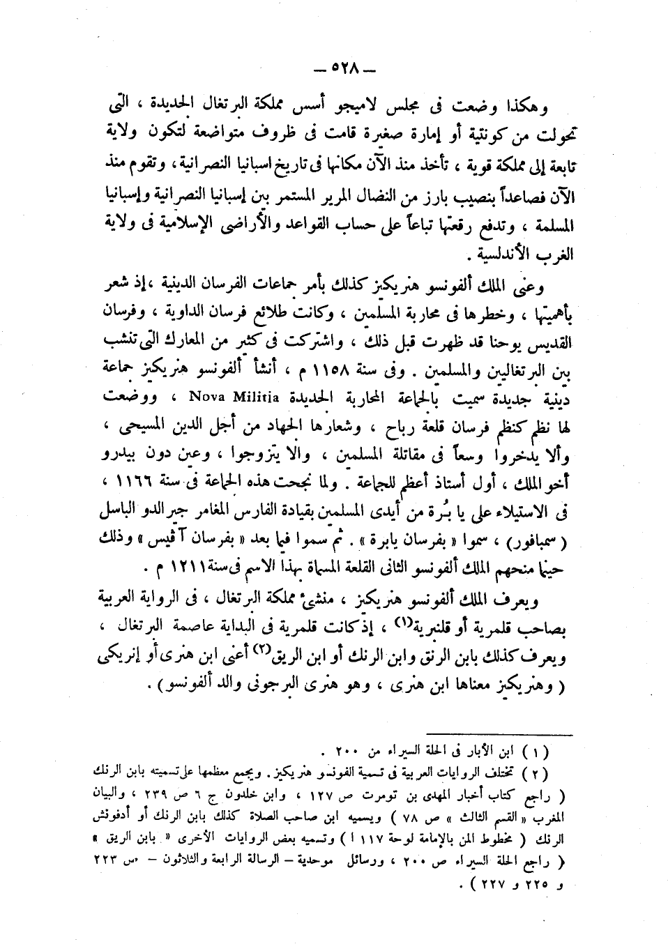 (¬2) تختلف الروايات العربية في تسمية ألفونسو هنريكيز. ويجمع معظمها على تسميته بابن الرنك (راجع كتاب أخبار المهدي بن تومرت ص 127، وابن خلدون ج 6 ص 239، والبيان المغرب " القسم الثالث " ص 78) ويسميه ابن صاحب الصلاة كذلك بابن الرنك أو أدفونش الرنك (مخطوط المن بالإمامة لوحة 117 أ) وتسميه بعض الروايات الأخرى " بابن الريق " (راجع الحلة السيراء ص 200، ورسائل موحدية - الرسالة الرابعة والثلاثون - ص 223 و 225 و 227).