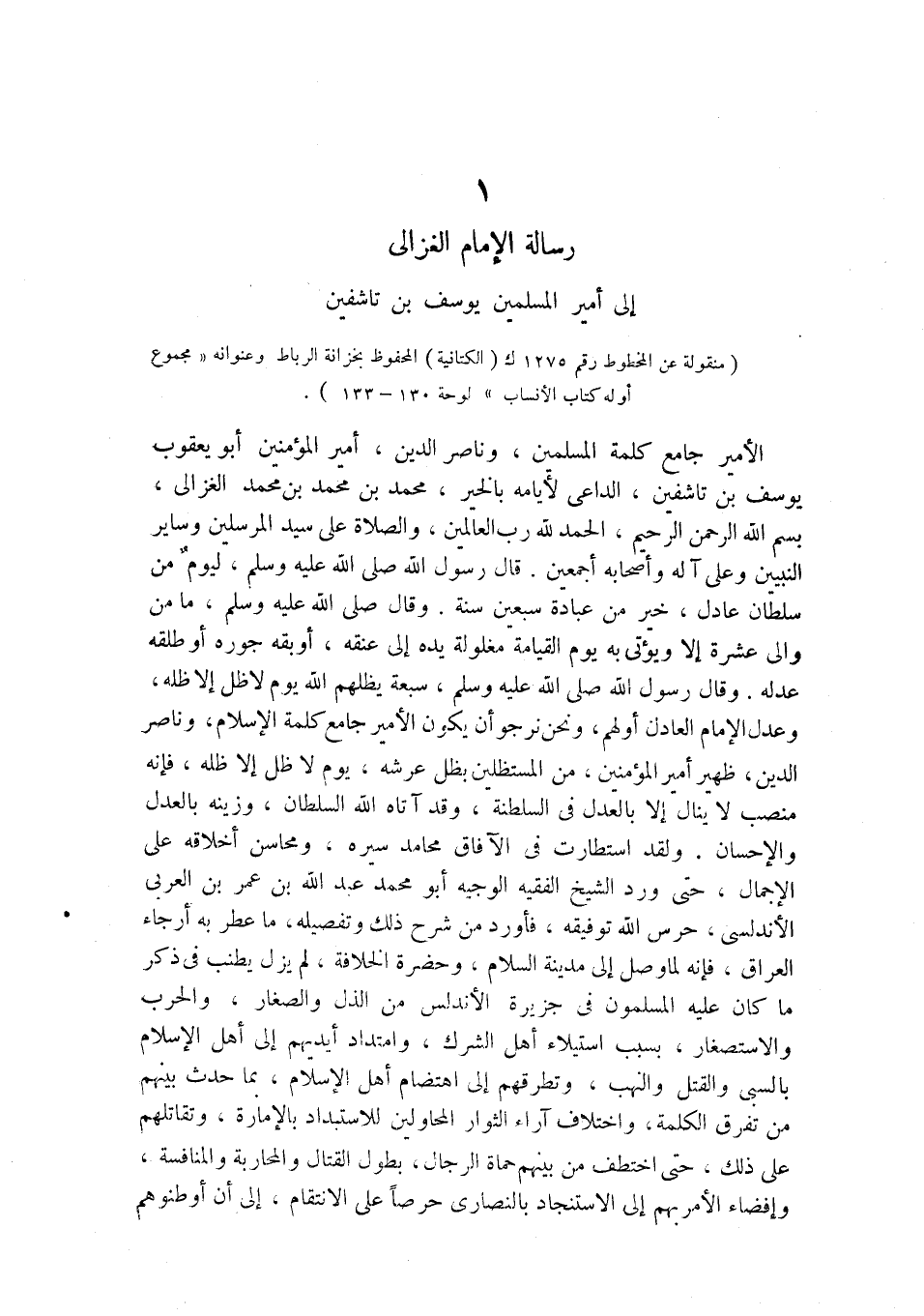 الأمير جامع كلمة المسلمين، وناصر الدين، أمير المؤمنين أبو يعقوب يوسف بن تاشفين، الداعي لأيامه بالخير، محمد بن محمد بن محمد الغزالي، بسم الله الرحمن الرحيم، الحمد لله رب العالمين، والصلاة على سيد المرسلين وساير النبيين وعلى آله وأصحابه أجمعين. قال رسول الله صلى الله عليه وسلم، ليومٌ من سلطان عادل، خير من عبادة سبعين سنة. وقال صلى الله عليه وسلم، ما من والى عشرة إلا ويؤتى به يوم القيامة مغلولة يده إلى عنقه، أوبقه جوره أو طلقه عدله. وقال رسول الله صلى الله عليه وسلم، سبعة يظلهم الله يوم لا ظل إلا ظله، وعدل الإمام العادل أولهم، ونحن نرجو أن يكون الأمير جامع كلمة الإسلام، وناصر الدين، ظهير أمير المؤمنين، من المستظلين بظل عرشه، يوم لا ظل إلا ظله، فإنه منصب لا ينال إلا بالعدل في السلطنة، وقد آتاه الله السلطان، وزينه بالعدل والإحسان. ولقد استطارت في الآفاق محامد سيره، ومحاسن أخلاقه على الإجمال، حتى ورد الشيخ الفقيه الوجيه أبو محمد عبد الله بن عمر بن العربي الأندلسي، حرس الله توفيقه، فأورد من شرح ذلك وتفصيله، ما عطر به أرجاء العراق، فإنه لما وصل إلى مدينة السلام، وحضرة الخلافة، لم يزل يطنب في ذكر ما كان عليه المسلمون في جزيرة الأندلس من الذل والصغار، والحرب والاستصغار، بسبب استيلاء أهل الشرك، وامتداد أيديهم إلى أهل الإسلام بالسبي والقتل والنهب، وتطرقهم إلى اهتضام أهل الإسلام، بما حدث بينهم من تفرق الكلمة، واختلاف آراء الثوار المحاولين للاستبداد بالإمارة، وتقاتلهم على ذلك، حتى اختطف من بينهم حماة الرجال، بطول القتال والمحاربة والمنافسة، وإفضاء الأمر بهم إلى الاستنجاد بالنصارى حرصاً على الانتقام، إلى أن أوطنوهم