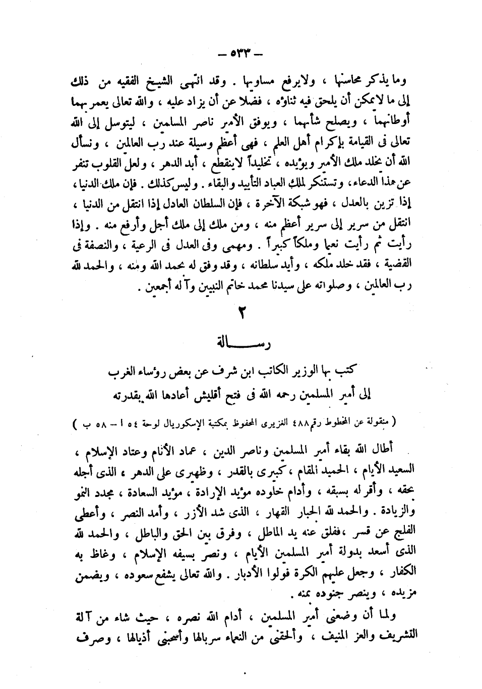 وما يذكر محاسنها، ولا يرفع مساويها. وقد انتهى الشيخ الفقيه من ذلك إلى ما لا يمكن أن يلحق فيه ثناؤه، فضلا عن أن يزاد عليه، والله تعالى يعمر بهما أوطانهما، ويصلح شأنهما، ويوفق الأمير ناصر المسلمين، ليتوسل إلى الله تعالى في القيامة بإكرام أهل العلم، فهي أعظم وسيلة عند رب العالمين، ونسأل الله أن يخلد ملك الأمير ويؤيده، تخليداً لا ينقطع، أبد الدهر، ولعل القلوب تنفر عن هذا الدعاء، وتستنكر لملك العباد التأييد والبقاء. وليس كذلك. فإن ملك الدنيا، إذا تزين بالعدل، فهو شبكة الآخرة، فإن السلطان العادل إذا انتقل من الدنيا، انتقل من سرير إلى سرير أعظم منه، ومن ملك إلى ملك أجل وأرفع منه. وإذا رأيت ثم رأيت نعيماً وملكاً كبيراً. ومهمى وفي العدل في الرعية، والنصفة في القضية، فقد خلد ملكه، وأيد سلطانه، وقد وفق له بحمد الله ومنه، والحمد لله رب العالمين، وصلواته على سيدنا محمد خاتم النبيين وآله أجمعين.