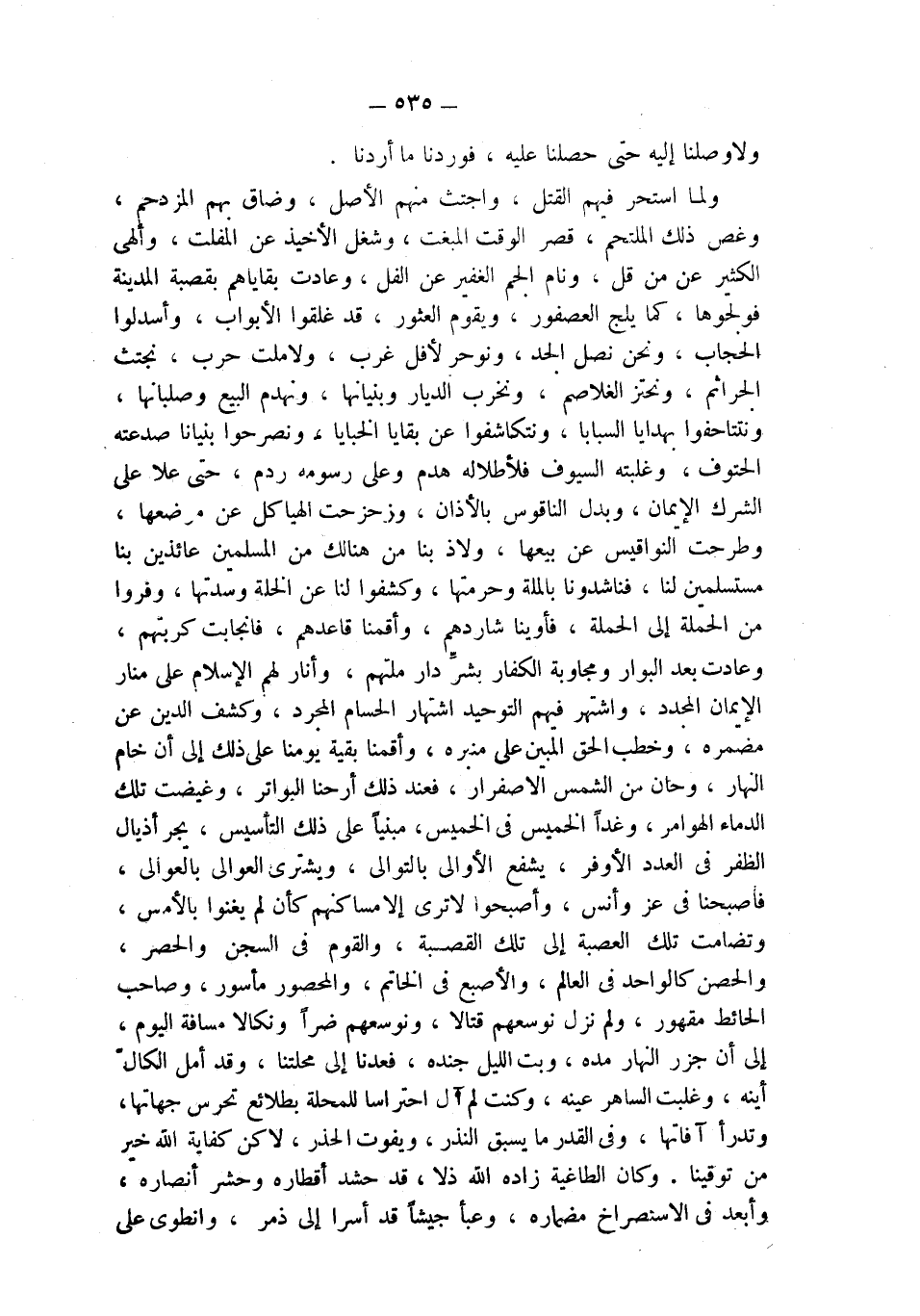 ولما استحر فيهم القتل، واجتث منهم الأصل، وضاق بهم المزدحم، وغص ذلك الملتحم، قصر الوقت المبغت، وشغل الأخيذ عن المفلت، وألهي الكثير عن من قل، ونام الجم الغفير عن الفل، وعادت بقاياهم بقصبة المدينة فولجوها، كما يلج العصفور، ويقوم العثور، قد غلقوا الأبواب، وأسدلوا الحجاب، ونحن نصل الجد، ونوحر لأفل غرب، ولا ملت حرب، نجتث الجراثم، ونحتز الغلاصم، ونخرب الديار وبنيانها، ونهدم البيع وصلبانها، ونتتاحفوا بهدايا السبابا، ونتكاشفوا عن بقايا الخبايا، ونصرحوا بنيانا صدعته الحتوف، وغلبته السيوف فلأطلاله هدم وعلى رسومه ردم، حتى علا على الشرك الإيمان، وبدل الناقوس بالأذان، وزحزحت الهياكل عن موضعها، وطرحت النواقيس عن بيعها، ولاذ بنا من هنالك من المسلمين عائذين بنا مستسلمين لنا، فناشدونا بالملة وحرمتها، وكشفوا لنا عن الخلة وسدتها، وفروا من الحملة إلى الحملة، فأوينا شاردهم، وأقمنا قاعدهم، فانجابت كربتهم، وعادت بعد البوار ومجاوبة الكفار بشرِّ دار ملتهم، وأنار لهم الإسلام على منار الإيمان المجدد، واشتهر فيهم التوحيد اشتهار الحسام المجرد، وكشف الدين عن مضمره، وخطب الحق المبين على منبره، وأقمنا بقية يومنا على ذلك إلى أن خام النهار، وحان من الشمس الاصفرار، فعند ذلك أرحنا البواتر، وغيضت تلك الدماء الهوامر، وغداً الخميس في الخميس، مبنياً على ذلك التأسيس، يجر أذيال الظفر في العدد الأوفر، يشفع الأوالي بالتوالي، ويشتري العوالي بالعوالي، فأصبحنا في عز وأنس، وأصبحوا لا ترى إلا مساكنهم كأن لم يغنوا بالأمس، وتضامت تلك العصبة إلى تلك القصبة، والقوم في السجن والحصر، والحصن كالواحد في العالم، والأصبع في الخاتم، والمحصور مأسور، وصاحب الحائط مقهور، ولم نزل نوسعهم قتالا، ونوسعهم ضراً ونكالا مسافة اليوم، إلى أن جزر النهار مده، وبت الليل جنده، فعدنا إلى محلتنا، وقد أمل الكالّ أينه، وغلبت الساهر عينه، وكنت لم آل احتراساً للمحلة بطلائع تحرس جهاتها، وتدرأ آفاتها، وفي القدر ما يسبق النذر، ويفوت الحذر، لاكن كفاية الله خير من توقينا. وكان الطاغية زاده الله ذلا، قد حشد أقطاره وحشر أنصاره، وأبعد في الاستصراخ مضماره، وعبأ جيشاً قد أسرا إلى ذمر، وانطوى على