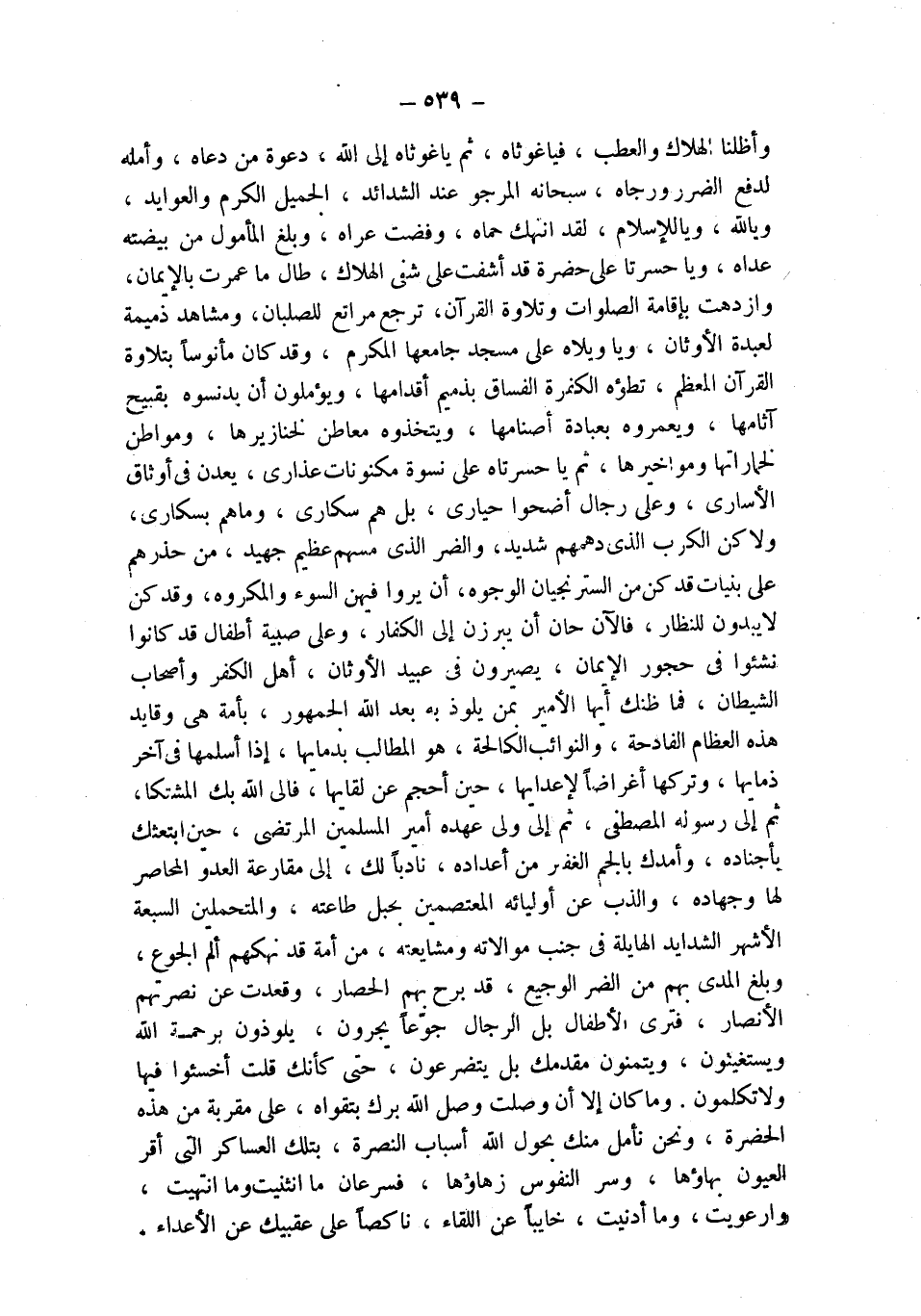 وأظلنا الهلاك والعطب، فياغوثاه، ثم ياغوثاه إلى الله، دعوة من دعاه، وأمله لدفع الضرر ورجاه، سبحانه المرجو عند الشدائد، الجميل الكرم والعوايد، ويالله، وياللإسلام، لقد انتهك حماه، وفضت عراه، وبلغ المأمول من بيضته عداه، ويا حسرتا على حضرة قد أشفت على شفي الهلاك، طالما عمرت بالإيمان، وازدهت بإقامة الصلوات وتلاوة القرآن، ترجع مراتع للصلبان، ومشاهد ذميمة لعبدة الأوثان، ويا ويلاه على مسجد جامعها المكرم، وقد كان مأنوساً بتلاوة القرآن المعظم، تطؤه الكفرة الفساق بذميم أقدامها، ويؤملون أن يدنسوه بقبيح آثامها، ويعمروه بعبادة أصنامها، ويتخذوه معاطن لخنازيرها، ومواطن لخماراتها ومواخيرها، تم يا حسرتاه على نسوة مكنونات عذارى، يعدن في أوثاق الأسارى، وعلى رجال أضحوا حيارى، بل هم سكارى، وما هم بسكارى، ولاكن الكرب الذي دهمهم شديد، والضر الذي مسهم عظيم جهيد، من حذرهم على بنيات قد كن من الستر نجيان الوجوه، أن يروا فيهن السوء والمكروه، وقد كن لا يبدون للنظار، فالآن حان أن يبرزن إلى الكفار، وعلى صبية أطفال قد كانوا نشئوا في حجور الإيمان، يصيرون في عبيد الأوثان، أهل الكفر وأصحاب الشيطان، فما ظنك أيها الأمير بمن يلوذ به بعد الله الجمهور، بأمة هي وقايد هذه العظام الفادحة، والنوائب الكالحة، هو المطالب بدمايها، إذا أسلمها في آخر ذمايها، وتركها أغراضاً لأعدايها، حين أحجم عن لقايها، فإلى الله بك المشتكا، ثم إلى رسوله المصطفى، ثم إلى ولي عهده أمير المسلمين المرتضي، حين ابتعثك بأجناده، وأمدك بالجم الغفير من أعداده، نادباً لك، إلى مقارعة العدو المحاصر لها وجهاده، والذب عن أوليائه المعتصمين بحبل طاعته، والمتحملين السبعة الأشهر الشدايد الهايلة في جنب موالاته ومشايعته، من أمة قد نهكهم ألم الجوع، وبلغ المدى بهم من الضر الوجيع، قد برح بهم الحصار، وقعدت عن نصرتهم الأنصار، فترى الأطفال بل الرجال جوّعاً يجرون، يلوذون برحمة الله ويستغيثون، ويتمنون مقدمك بل يتضرعون، حتى كأنك قلت أخسئوا فيها ولا تكلمون. وما كان إلا أن وصلت وصل الله برك بتقواه، على مقربة من هذه الحضرة، ونحن نأمل منك بحول الله أسباب النصرة، بتلك العساكر التي أقر العيون بهاؤها، وسر النفوس زهاؤها، فسرعان ما انثنيت وما انتهيت، وارعويت، وما أدنيت، خايباً عن اللقاء، ناكصاً على عقبيك عن الأعداء.