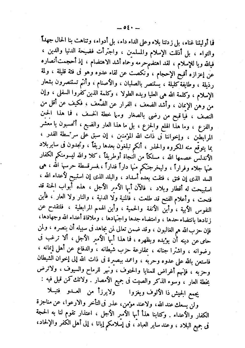 فما أوليتنا غناء، بل زدتنا بلاء وعلى الداء داء، بل أدواء، وتناهت بنا الحال جهداً والتواء، بل أذللت الإسلام والمسلمين، واجترأت فضيحة الدنيا والدين، فيالله ويا للإسلام، لقد اهتضم حرمه وحماه أشد الاهتضام، إذ أحجمت أنصاره عن إعزازه أقبح الإحجام، ونكصت عن لقاء عدوه وهو في فئة قليلة، ولمة رذيلة، وطايفة كليلة، يستنصر بالصلبان، والأصنام، وأنتم تستنصرون بشعار الإسلام، وكلمة الله هي العليا ويده الطولا، وكلمة الذين كفروا السفلى، وإن من وهن الإيمان، وأشد الضعف، الفرار عن الضِّعف، فكيف عن أقل من النصف، فيا قبح من رضى بالصغار وسما خطة الخسف، فما هذا الجبن والفزع، وما هذا الهلع والجزع، بل ما هذا العار. والضيع، أتحسبون يا معشر المرابطين، وإخواننا في ذات الله المؤمنين، إن سبق على سرقسطة القدر، بما يتوقع منه المكروه والحذر، أنكم تبلغون بعدها ريقاً، وتجدون في ساير بلاد الأندلس عصمها الله، مسلكاً من النجاة أو طريقاً، كلا والله ليسومنكم الكفار عنها جلاء وفراراً، وليخرجنّكم منها داراً فداراً، فسرقسطة حرسها الله، هي السد الذي إن فتق، فتقت بعده أسداد، والبلد الذي إن استبيح لأعداء الله، استبيحت له أقطار وبلاد، فالآن أيها الأمير الأجل، هذه أبواب الجنة قد فتحت، وأعلام الفتح قد طلعت، فالمنية ولا الدنية، والنار ولا العار، فأين النفوس الأبية، وأين الأنفة والحمية، وأين الهمم المرابطية، فلتقدح عن زنادها بانتضاء حدها، وامتضاء جدها واجتهادها، وملاقاة أعداء الله وجهادها، فإن حزب الله هم الغالبون، وقد ضمن تعالى لمن يجاهد في سبيله أن ينصره، ولمن حامى عن دينه أن يؤيده ويظهره، فما هذا أيها الأمير الأجل، ألا ترغب في رضوانه، واشترا جنانه، بمقارعة حزب شيطانه، والدفاع عن أهل إيمانه، فاستعن بالله على عدوه وحربه، واعمد ببصيرة في ذات الله إلى إخوان الشيطان وحزبه، فإنهم أغراض للمنايا والحتوف، ونهر للرماح والسيوف، ولا ترض بخطة العار، وسوء الذكر والصيت في جميع الأمصار. ولا تك كمن قيل فيه: