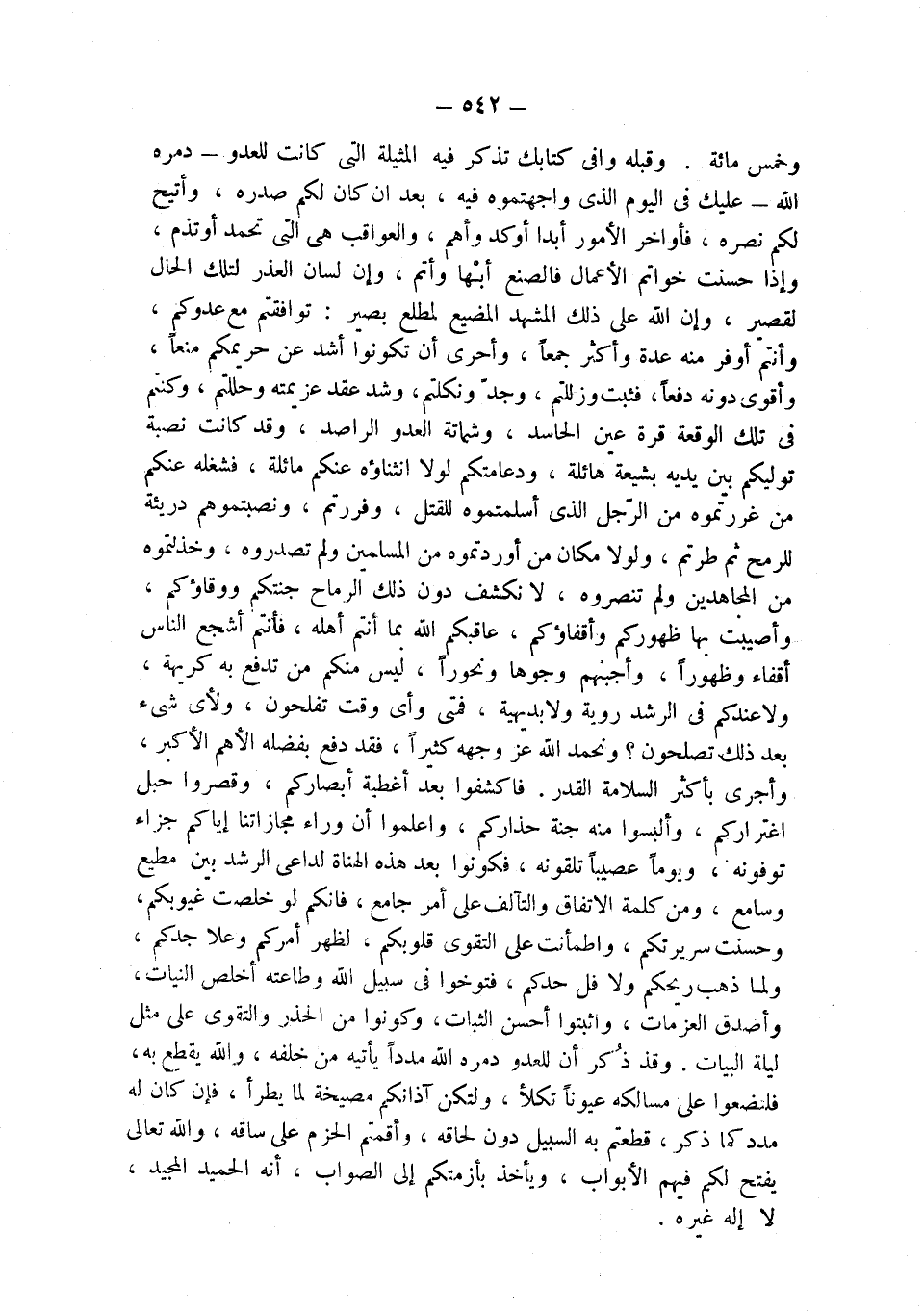 وخمس مائة. وقبله وافى كتابك تذكر فيه المثيلة التي كانت للعدو- دمره الله - عليك في اليوم الذي واجهتموه فيه، بعد ان كان لكم صدره، وأتيح لكم نصره، فأواخر الأمور أبدا أوكد وأهم، والعواقب هي التي تحمد أو تذم، وإذا حسنت خواتم الأعمال فالصنع أبْها وأتم، وإن لسان العذر لتلك الحال لقصير، وإن الله على ذلك المشهد المضيع لمطلع بصير: توافقتم مع عدوكم، وأنتم أوفر منه عدة وأكثر جمعاً، وأحرى أن تكونوا أشد عن حريمكم منعاً، وأقوى دونه دفعاً، فثبت وزللتم، وجدّ ونكلتم، وشد عقد عزيمته وحللتم، وكنتم في تلك الوقعة قرة عين الحاسد، وشماتة العدو الراصد، وقد كانت نصبة توليكم بين يديه بشيعة هائلة، ودعامتكم لولا إنثناؤه عنكم ماثلة، فشغله عنكم من غررتموه من الرّجل الذي أسلمتموه للقتل، وفررتم، ونصبتموهم دريئة للرمح ثم طرتم، ولولا مكان من أوردتموه من المسلمين ولم تصدروه، وخذلتموه من المجاهدين ولم تنصروه، لانكشف دون ذلك الرماح جنتكم ووقاؤكم، وأصيبت بها ظهوركم وأقفاؤكم، عاقبكم الله بما أنتم أهله، فأنتم أشجع الناس أقفاء وظهوراً، وأجبنهم وجوهاً ونحوراً، ليس منكم من تدفع به كريهة، ولا عندكم في الرشد روية ولا بديهية، فمتى وأي وقت تفلحون، ولأي شىء بعد ذلك تصلحون؟ ونحمد الله عز وجهه كثيراً، فقد دفع بفضله الأهم الأكبر، وأجرى بأكثر السلامة القدر. فاكشفوا بعد أغطية أبصاركم، وقصروا حبل اغتراركم، وألبسوا منه جنة حذاركم، واعلموا أن وراء مجازاتنا إياكم جزاء توفونه، ويوماً عصيباً تلقونه، فكونوا بعد هذه الهناة لداعي الرشد بين مطيع وسامع، ومن كلمة الاتفاق والتآلف على أمر جامع، فإنكم لو خلصت غيوبكم، وحسنت سريرتكم، واطمأنت على التقوى قلوبكم، لظهر أمركم وعلا جدكم، ولما ذهب ريحكم ولا فل حدكم، فتوخوا في سبيل الله وطاعته أخلص النيات، وأصدق العزمات، واثبتوا أحسن الثبات، وكونوا من الحذر والتقوى على مثل ليلة البيات. وقد ذُكر أن للعدو دمره الله مدداً يأتيه من خلفه، والله يقطع به، فلتضعوا على مسالكه عيوناً تكلأ، ولتكن آذانكم مصيغة لما يطرأ، فإن كان له مدد كما ذكر، قطعتم به السبيل دون لحاقه، وأقمتم الحزم على ساقه، والله تعالى يفتح لكم فيهم الأبواب، ويأخذ بأزمتكم إلى الصواب، إنه الحميد المجيد، لا إله غيره.